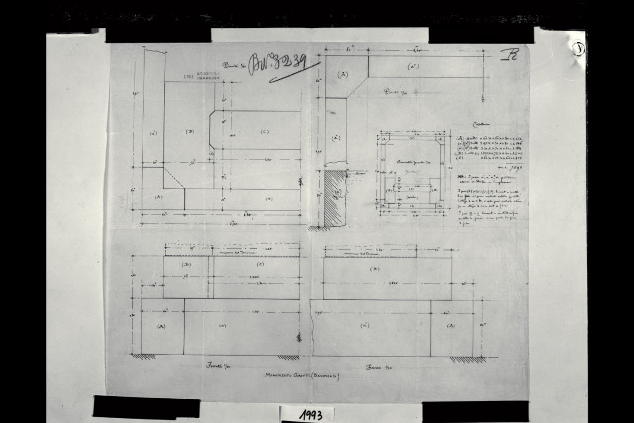 Milano, Cimitero Monumentale. Monumento funerario della Famiglia Gritti (Spazio 129, Riparto III, Zona I). Piante e Dettaglio (Fronte) del basamento. Milano, Cimitero Monumentale. Monumento funerario della Famiglia Gritti (Spazio 129, Riparto III, Zona I). Piante e Dettaglio (Fronte) del basamento