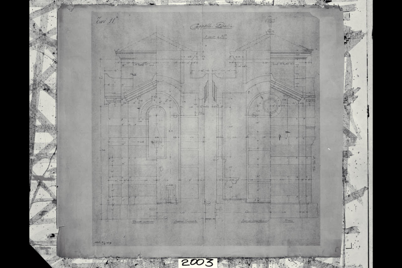 Cappella Pirelli. Prospetto posteriore e sezione trasversale. Sezione longitudinale e fianco. Cappella Pirelli. Prospetto posteriore e sezione trasversale. Sezione longitudinale e fianco