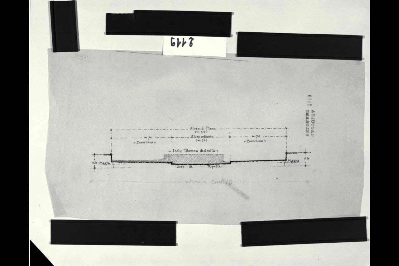 Isola Tiberina. Sezione dell'alveo del fiume e dell'isola Tiberina distrutta. Isola Tiberina. Sezione dell'alveo del fiume e dell'isola Tiberina distrutta