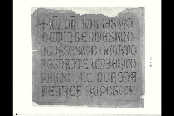 Monza, Basilica di San Giovanni. Cappella della Regina Teodolinda. Lapide dedicatoria del restauro del 1894 e del ricollocamento della Corona Ferrea. Monza, Basilica di San Giovanni. Cappella della Regina Teodolinda. Lapide dedicatoria del restauro del 1894 e del ricollocamento della Corona Ferrea