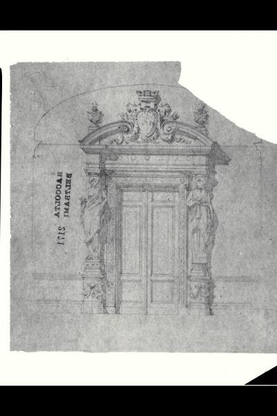 Parigi, Hotel de Ville. Prospetto di portale. Prospetto di una porta con cariatidi ai lati e timpano interrotto da un grande stemma