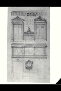 Schizzo delle pareti di un interno. Sopra sono due porte a doppia anta sormontate da timpani spezzati e separate da un camino; sotto sono ripetute le due porte con cornice più semplice, separate da stemma e sormontate da fregio a grandi riquadri. Schizzo delle pareti di un interno. Sopra sono due porte a doppia anta sormontate da timpani spezzati e separate da un camino; sotto sono ripetute le due porte con cornice più semplice, separate da stemma e sormontate da fregio a grandi riquadri