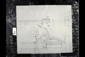 Dettaglio del coronamento di un edificio con coppia di sculture decorative. Prospetto e dettaglio della sezione. Dettaglio del coronamento di un edificio con coppia di sculture decorative. Prospetto e dettaglio della sezione