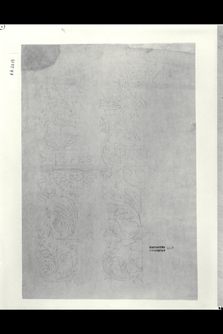 Schizzi di decorazioni con cartelle con dedica latina ad "Amor" e "Spes". Schizzi di decorazioni con cartelle con dedica latina ad "Amor" e "Spes"
