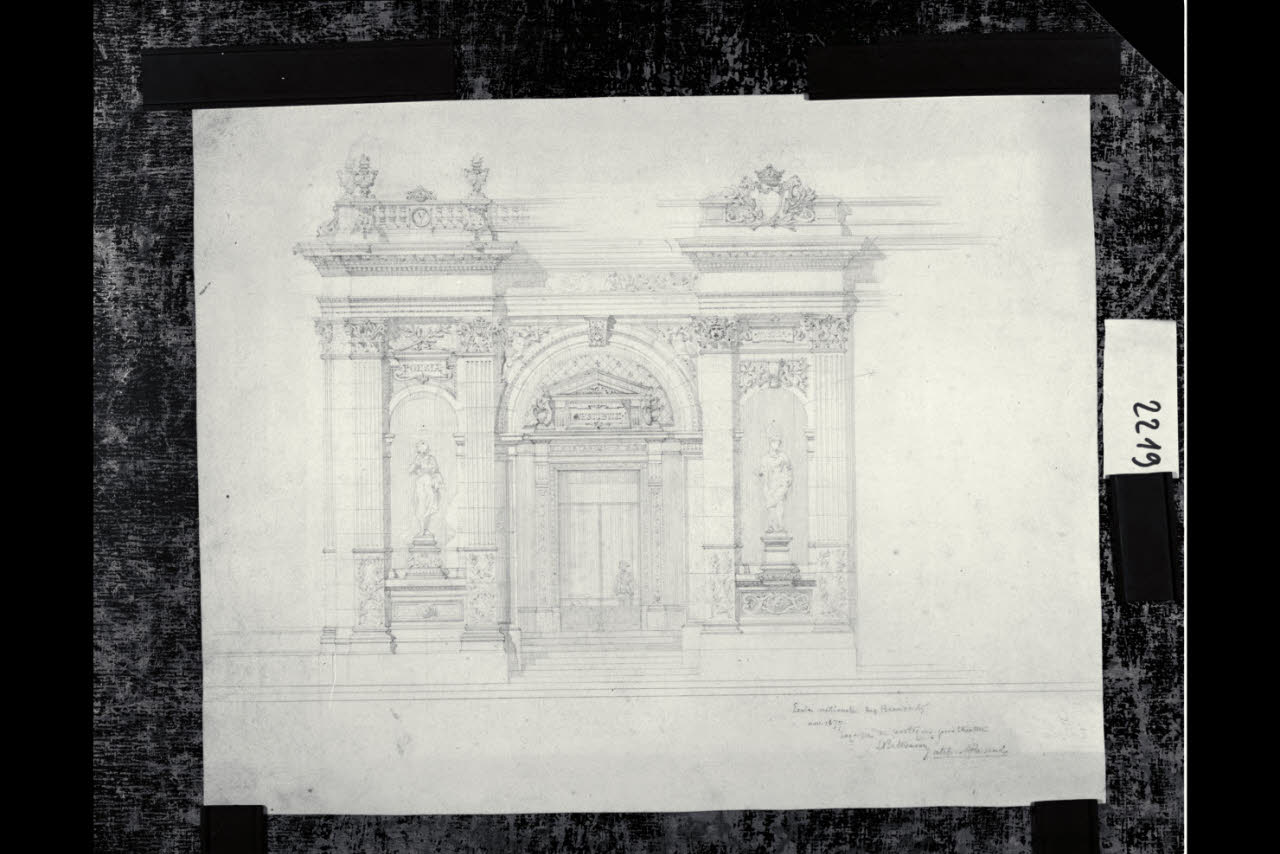Ecole National des Beaux Arts. Prospetto per il teatro. Il disegno raffigura la porta di ingresso al vestibolo. Ecole National des Beaux Arts. Prospetto per il teatro. Il disegno raffigura la porta di ingresso al vestibolo