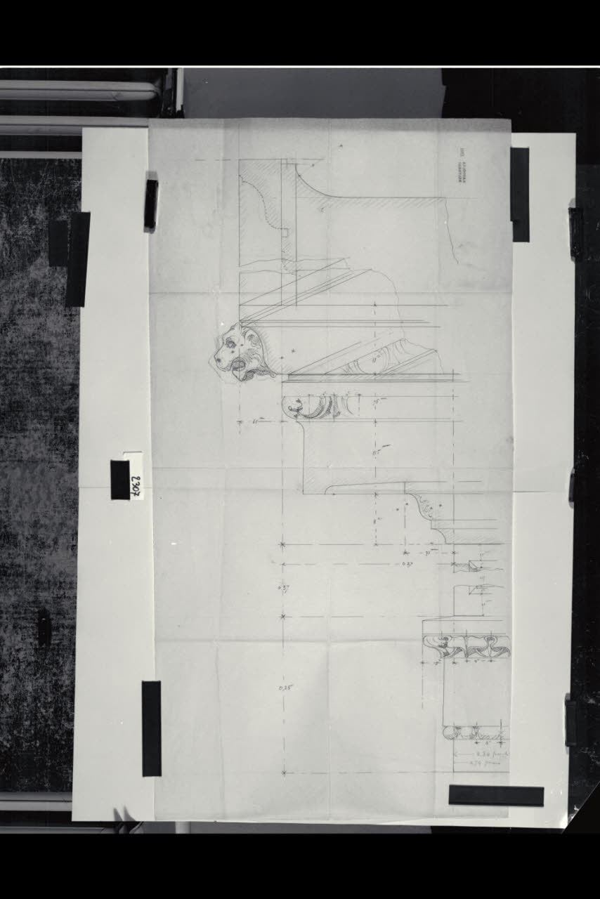 Sezione di uno spiovente con testa leonina e di un fregio. Sezione di uno spiovente con testa leonina e di un fregio