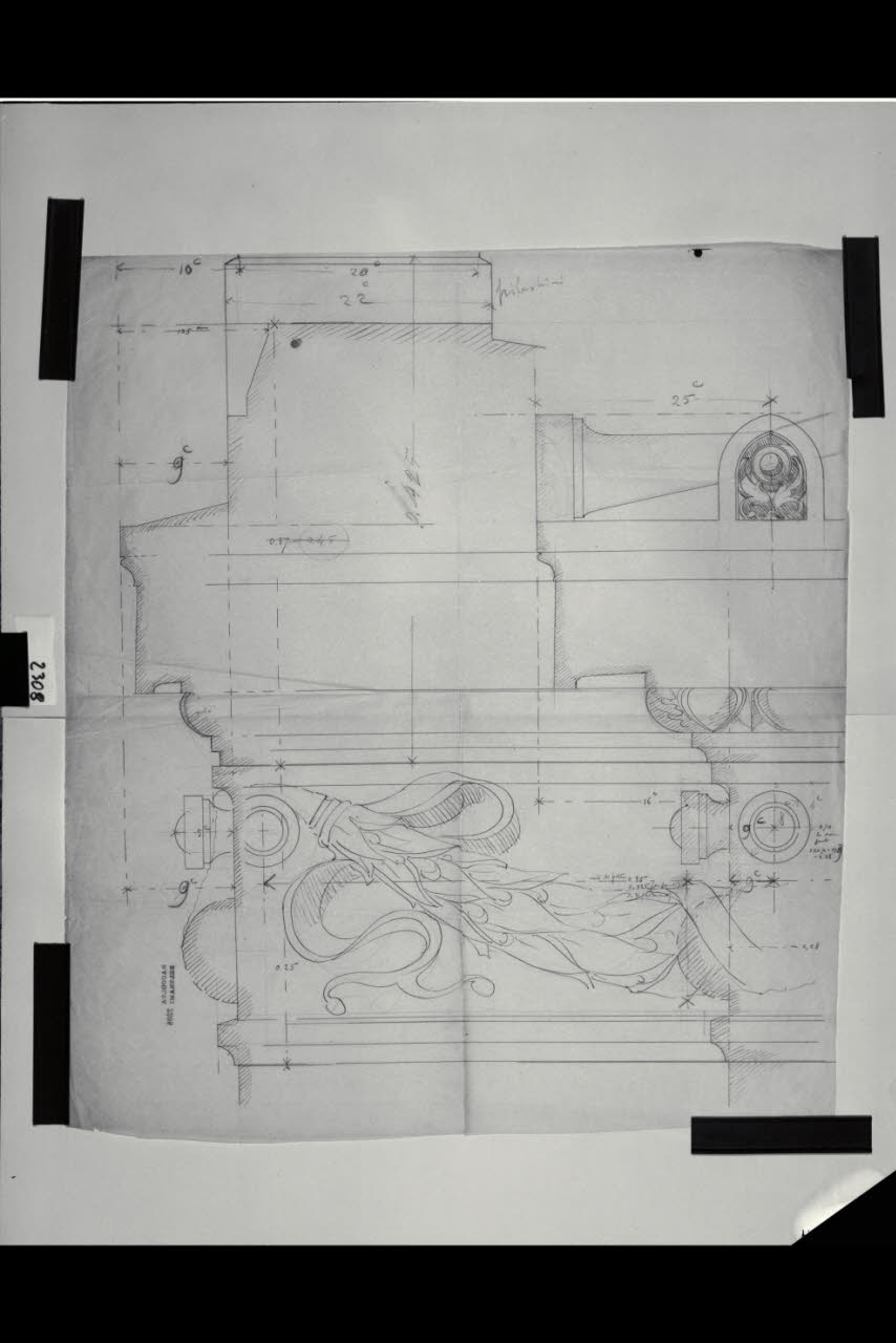 Prospetto e sezione di un fregio a ghirlande di alloro. Prospetto e sezione di un fregio a ghirlande di alloro