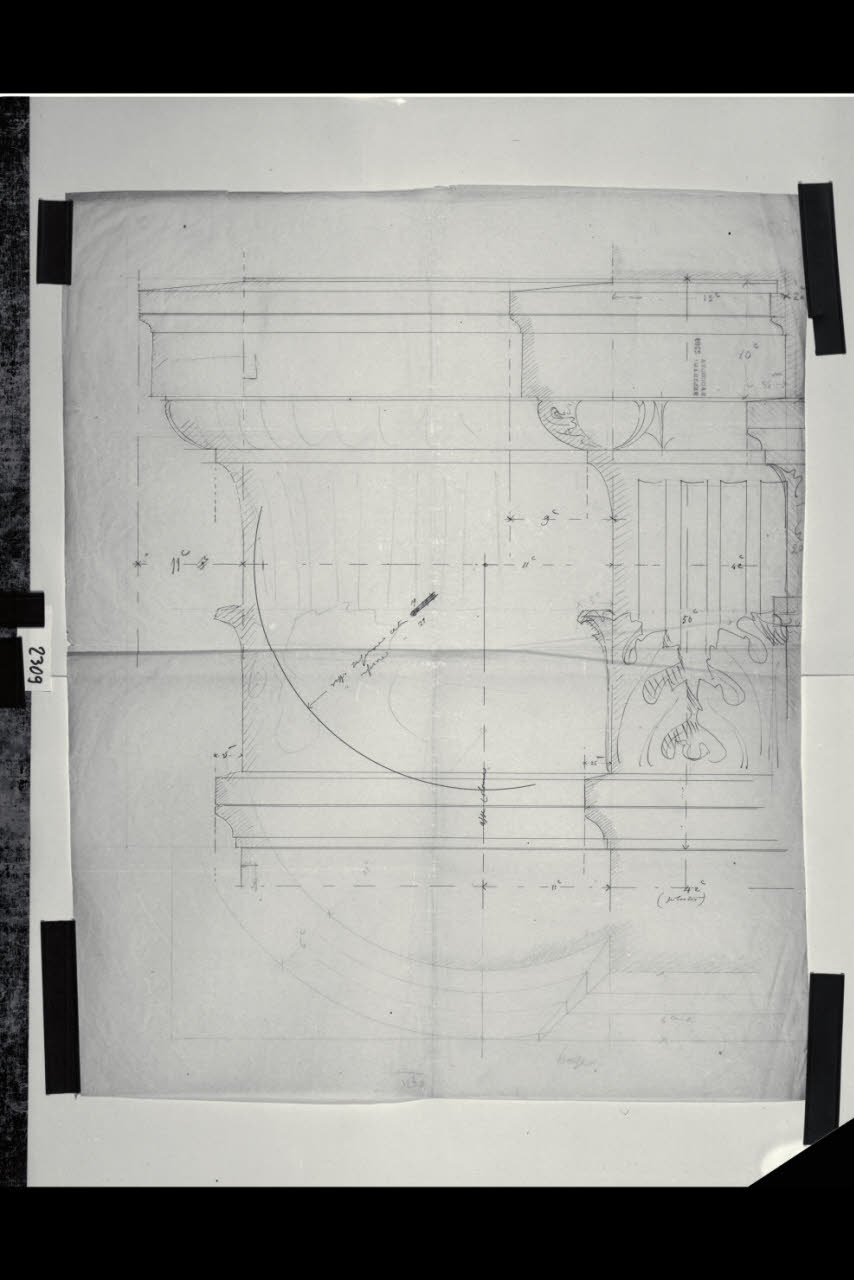 Prospetto e sezione di un fregio con decorazione a piccoli ovoli e foglie d'acanto. Prospetto e sezione di un fregio con decorazione a piccoli ovoli e foglie d'acanto