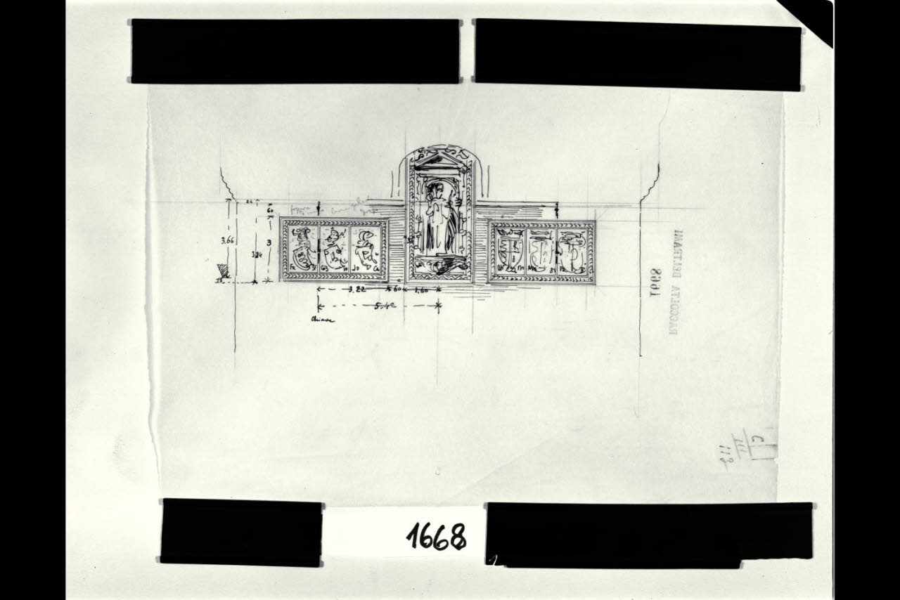 Disegno dell’edicola con statua di S. Ambrogio della Torre Umberto I del Castello Sforzesco di Milano e pannelli decorativi ai lati. Disegno dell’edicola con statua di S. Ambrogio della Torre Umberto I del Castello Sforzesco di Milano e pannelli decorativi ai lati