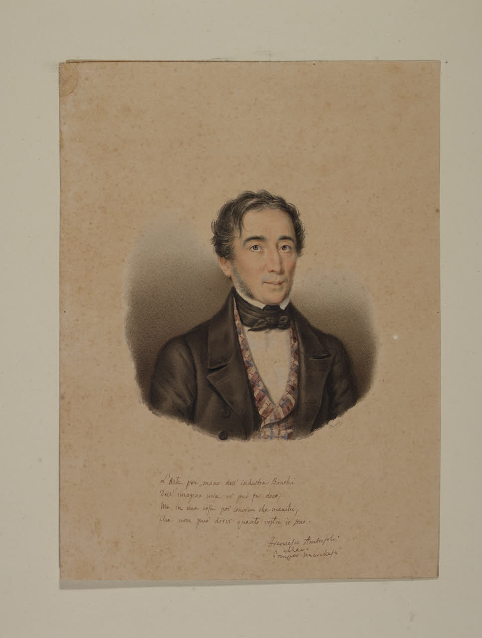 - NOTIZIE STORICO CRITICHE L'acquarello fa parte di una serie di ritratti raffiguranti alcuni amici dello scultore Pompeo Marchesi, realizzati da Giorgio Banchi verso la metà degli Quaranta dell'Ottocento e giunti nelle collezioni civiche milanesi grazie al legato Marchesi-Fogliani del 1862 (invv. Aggiunte 49-55). Il foglio ritrae Francesco Ambrosoli, letterato comasco che sotto la propria effige vergò una dedica all'amico scultore (cfr. scheda di B. Falconi, in Trasparenze. L'acquarello tra Romanticismo e Belle Epoque 2011, p. 54 cat. 8).