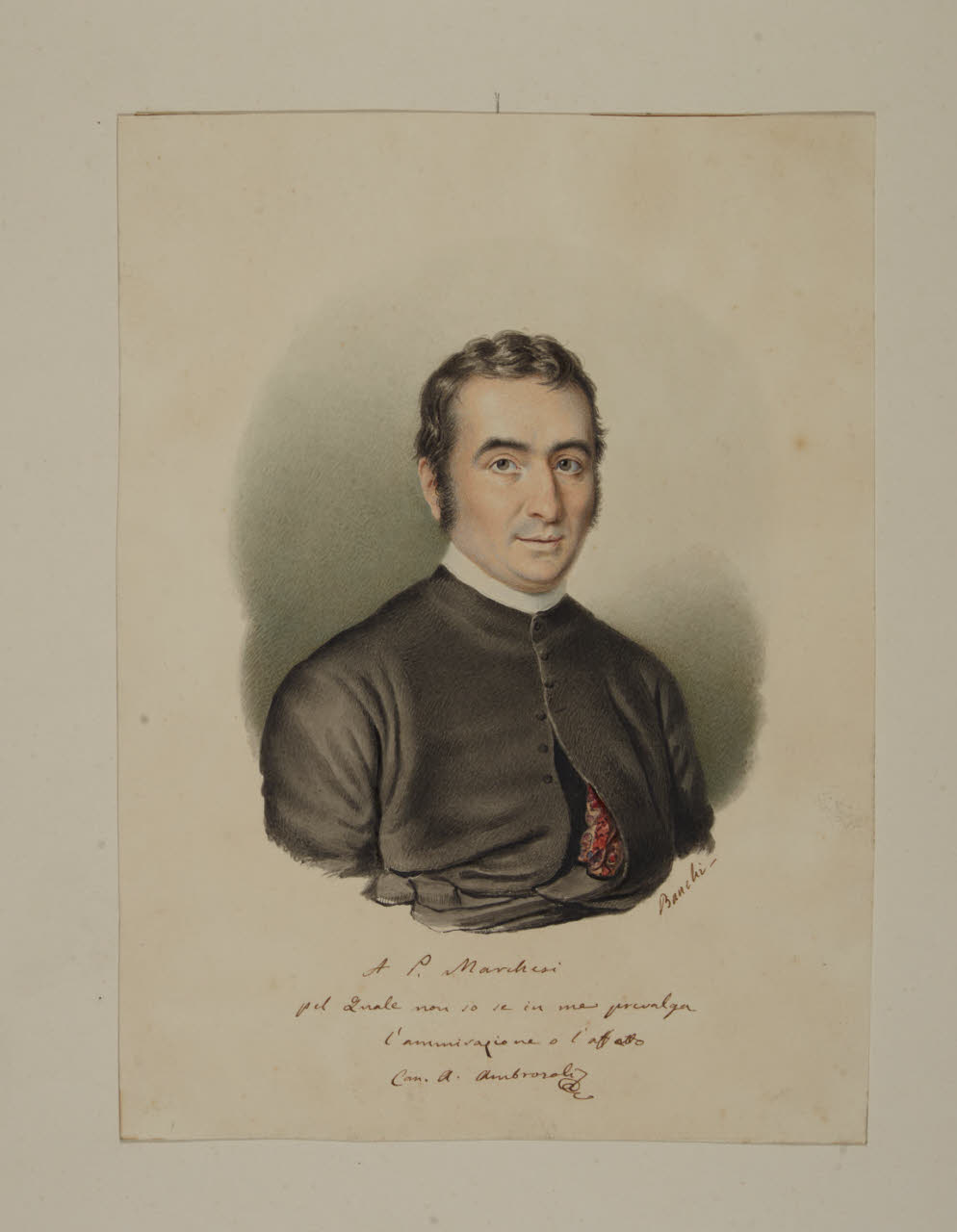 - NOTIZIE STORICO CRITICHE L'acquarello fa parte di una serie di ritratti raffiguranti alcuni amici dello scultore Pompeo Marchesi, realizzati da Giorgio Banchi verso la metà degli Quaranta dell'Ottocento e giunti nelle collezioni civiche milanesi grazie al legato Marchesi-Fogliani del 1862 (invv. Aggiunte 49-55). Il foglio ritrae il canonico Ambrogio Ambrosoli, educatore e pedagogista milanese che sotto la propria effige vergò una dedica all'amico scultore (cfr. scheda di B. Falconi, in Trasparenze. L'acquarello tra Romanticismo e Belle Epoque 2011, p. 54 cat. 8).