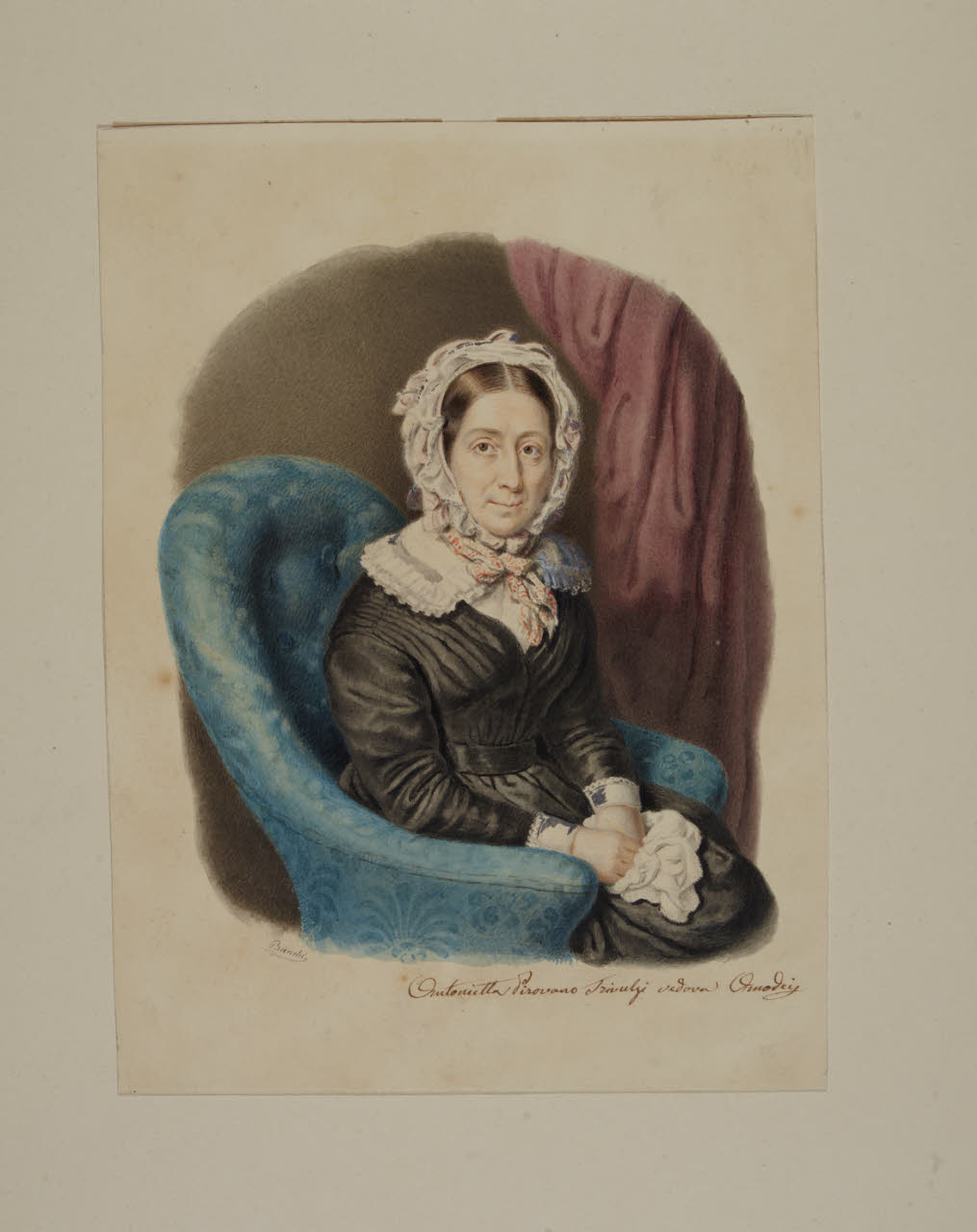 - NOTIZIE STORICO CRITICHE L'effige di Antonietta Pirovano Triulzi vedova Omodei fa parte di una serie di ritratti di amici dello scultore Pompeo Marchesi, realizzati da Giorgio Banchi verso la metà degli Quaranta dell'Ottocento e giunti nelle collezioni civiche milanesi grazie al legato Marchesi-Fogliani del 1862 (invv. Aggiunte 49-55) (cfr. scheda di B. Falconi, in Trasparenze. L'acquarello tra Romanticismo e Belle Epoque 2011, p. 54 cat. 8).