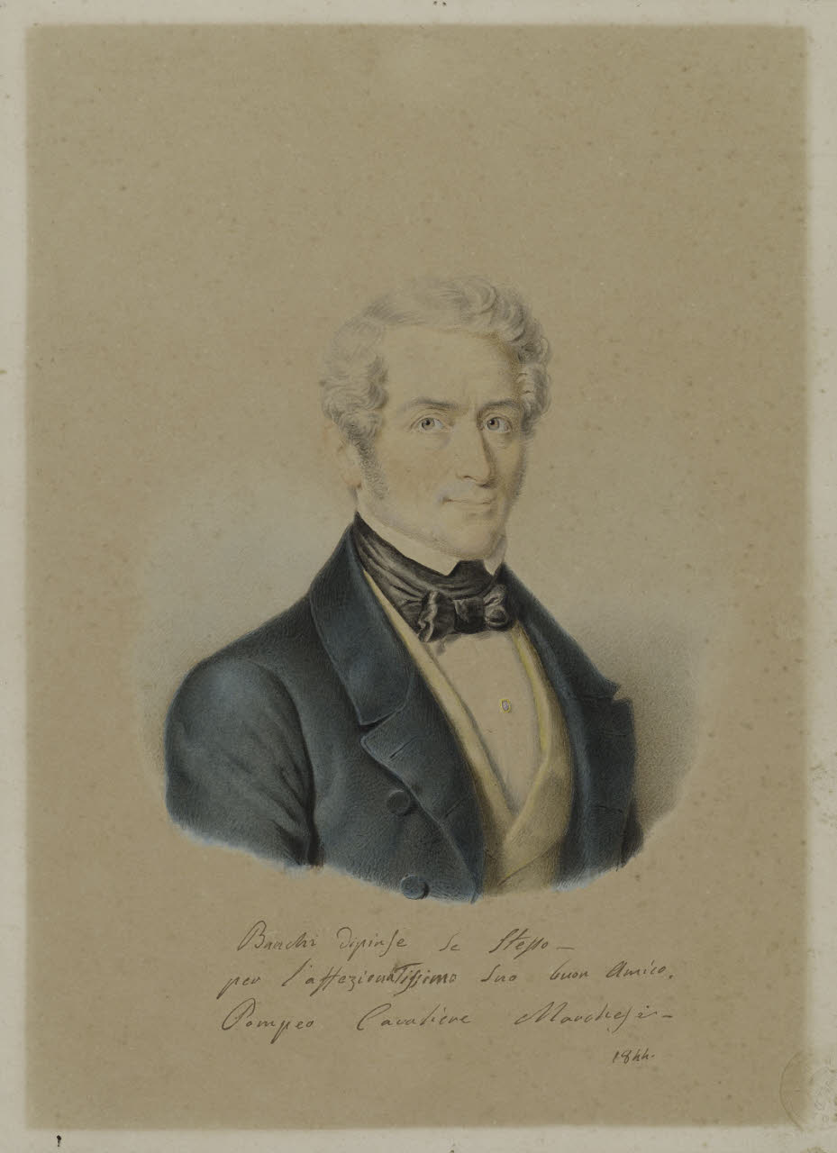 - NOTIZIE STORICO CRITICHE L'autoritratto di Giorgio Banchi fa parte di una serie di effigi raffiguranti alcuni amici di Pompeo Marchesi, eseguite dal pittore novarese verso la metà degli Quaranta dell'Ottocento e giunte nelle collezioni civiche milanesi grazie al legato Marchesi-Fogliani del 1862 (invv. Aggiunte 49-55). Sotto il proprio ritratto Banchi vergò una dedica all'amico scultore (cfr. scheda di B. Falconi, in Trasparenze. L'acquarello tra Romanticismo e Belle Epoque 2011, p. 54 cat. 8).\n