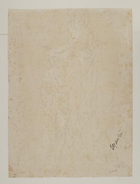 - NOTIZIE STORICO CRITICHE I disastri causati dalla Seconda guerra mondiale hanno prodotto tra gli artisti un forte senso di disperazione e un estremo bisogno di raffigurare il sacro. Interprete di tale necessità fu Giacomo Manzù il quale, mentre nel 1945 presentava gli studi sul tema della Crocifissione, bassorilievi realizzati tra il 1939 e il 1942, annunciava la realizzazione di altre due serie di opere: la Pietà e il Convegno dei Santi e martiri (Dallaj 1991). A queste opere e alla Pietà Rondanini di Michelangelo gli studiosi hanno messo in relazione i due disegni con i rispettivi studi (sul verso di ogni foglio), realizzati dall'artista nel 1945 e acquistati per le Raccolte Civiche Milanesi nel 1953 (invv. 428 Recto, inv. 429 Recto)\nLa composizione di tali opere riprende, infatti, uno degli ultimi bassorilievi della Crocifissione dell'artista, costruita sulla centralità verticale del corpo di Cristo, e si riallaccia all'opera michelangiolesca "nell'urgenza di catturarne, attraverso il segno, il vibrante luminismo della superba 'plastica come frammento' tanto congeniale alla sensibilità di Manzù" (Dallaj 1991). Come osservato da Paolo Rusconi, inoltre, il legame iconografico e l'intensa drammaticità comune all'opera di Michelangelo si evince chiaramente dallo schizzo a matita presente sul verso di uno dei fogli; esso è presentato "nel voluto arcaismo della composizione e nella disposizione delle figure. La ricerca di contorni crudamente segnati e di anatomie al limite della deformazione, manifestano l'interesse per la cultura del Nord e per una religiosità severa, attenta alle sensibilità individuali" (Rusconi 2001).