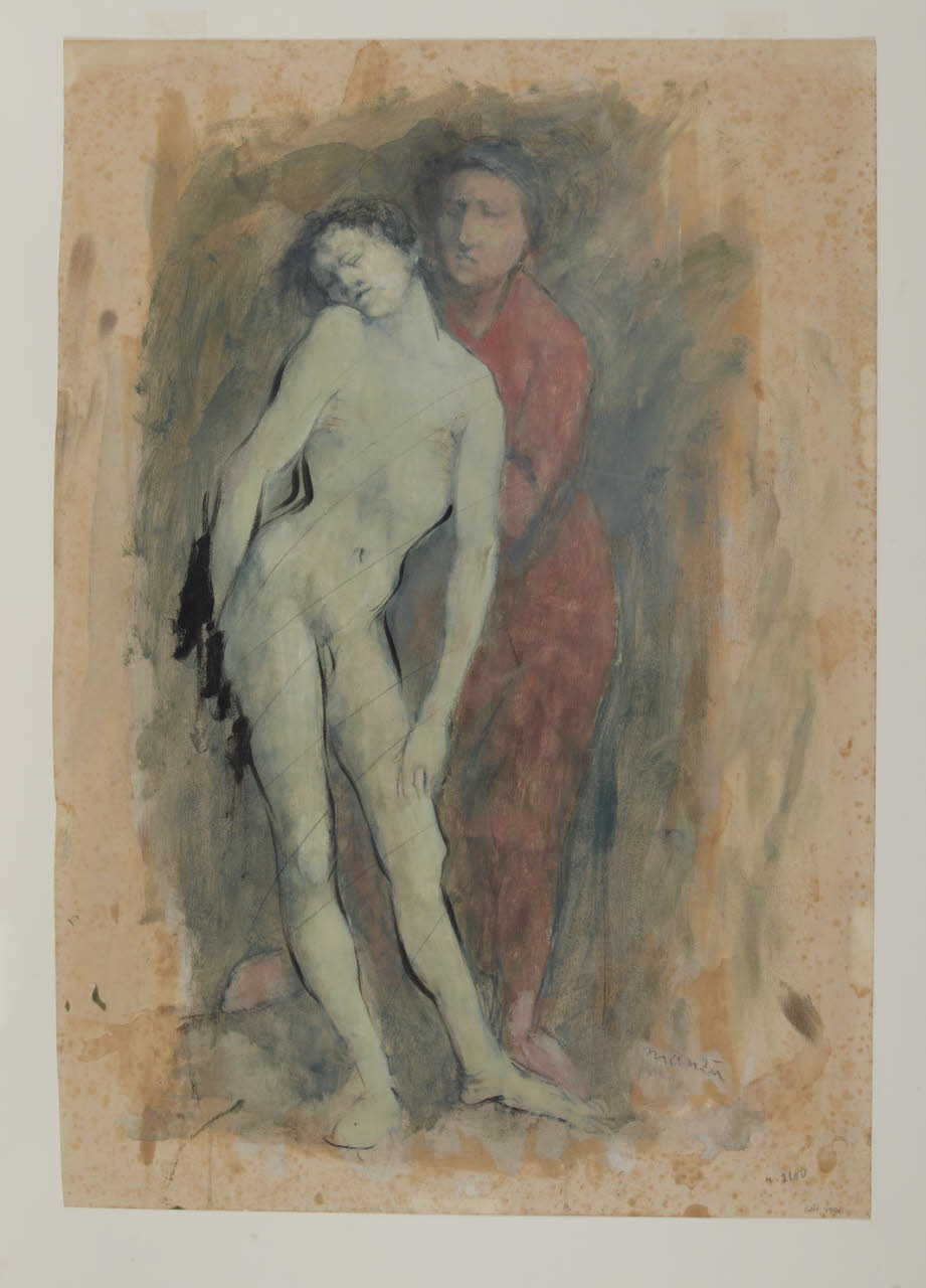 - NOTIZIE STORICO CRITICHE I disastri causati dalla Seconda guerra mondiale hanno prodotto tra gli artisti un forte senso di disperazione e un estremo bisogno di raffigurare il sacro. Interprete di tale necessità fu Giacomo Manzù il quale, mentre nel 1945 presentava gli studi sul tema della Crocifissione, bassorilievi realizzati tra il 1939 e il 1942, annunciava la realizzazione di altre due serie di opere: la Pietà e il Convegno dei Santi e martiri (Dallaj 1991). A queste opere e alla Pietà Rondanini di Michelangelo gli studiosi hanno messo in relazione i due disegni con i rispettivi studi (sul verso di ogni foglio), realizzati dall'artista nel 1945 e acquistati per le Raccolte Civiche Milanesi nel 1953 (invv. 428 Recto, inv. 429 Recto)\nLa composizione di tali opere riprende, infatti, uno degli ultimi bassorilievi della Crocifissione dell'artista, costruita sulla centralità verticale del corpo di Cristo, e si riallaccia all'opera michelangiolesca "nell'urgenza di catturarne, attraverso il segno, il vibrante luminismo della superba 'plastica come frammento' tanto congeniale alla sensibilità di Manzù" (Dallaj 1991). Come osservato da Paolo Rusconi, inoltre, il legame iconografico e l'intensa drammaticità comune all'opera di Michelangelo si evince chiaramente dallo schizzo a matita presente sul verso di uno dei fogli; esso è presentato "nel voluto arcaismo della composizione e nella disposizione delle figure. La ricerca di contorni crudamente segnati e di anatomie al limite della deformazione, manifestano l'interesse per la cultura del Nord e per una religiosità severa, attenta alle sensibilità individuali" (Rusconi 2001).