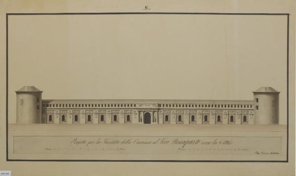 - NOTIZIE STORICO CRITICHE Il foglio mostra la proposta di modifica di Luigi Canonica per il progetto del Foro Bonaparte di Giovanni Antolini. Nei primi anni dell'Ottocento, soprattutto fra 1803 e 1805, vennero proposte modifiche sulle soluzioni da dare all'ex Castello trasformato in caserma. Altri progetti furono presentati da Carlo Barabino, uno dei membri della Commissione governativa del 1801, e da Gerolamo Rossi, colonnello del genio. Secondo Soldini (1981, 1982), il disegno potrebbe essere del 1805-1807, e mostrerebbe rimandi palesi agli stilemi di architetti rivoluzionari come Jean-Jacques Lequeu; presenta, infatti, parecchi elementi eterogenei e un'accumulazione di di forme e stili: la gemetria pura delle torri; la ricchezza decorativa della facciata, ornata in sovrabbondanza; la suddivisione della parete in scomparti di gusto romantico. Nei suoi progetti in analisi, Canonica si avvale di un repertorio architettonico di grande impatto simbolico fondato sull’uso di ordini, bugnato e trofei, sufficientemente neutro da non essere sia celebrativo di Napoleone che espressivo del valore militare del nuovo Stato (Scotti Tosini 2011). Sempre secondo Scotti Tosini (2011), sono ravvisabili debiti pure nei confronti dell’architettura inglese di John Dance il giovane.