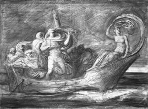 - NOTIZIE STORICO CRITICHE Il cartonetto, già identificato come "La barca di Ulisse" era uno studio per il dipinto "La Nave di Faone" per Villa Melzi d'Eril a Bellagio. Bossi accenna a questo soggetto nelle "Memorie": "Ho riabbozzato la barca di Faone per Gaetano Melzi, non essendo contento di alcune attitudini, che non osai cambiare sulla tela stessa per timor di peggiorare" (ed. Nenci 2004, p. 25). \n"Dalla Saffo, romanzo del Conte Alessandro Verri è tolto il soggetto di questo dipinto, [...]. Il naviglio di Faone dianzi sbattuto dai venti, privato dell'albero che portava la vela, in presa all'onde furiose del mare, viene guidato propiziamente verso Cipro dalla stessa Dea venerata in quell'isola, che sotto mortali forme non conosciuta vi era raccolta dal giovane nocchiero, cui per sventura di Saffo, doveva in guiderdone esser larga di una fatale bellezza" (così Girolamo Calvi in "L'Ape Italiana delle Belle Arti", a. II, vol. II, Roma 1836, descrizione della tavola V).