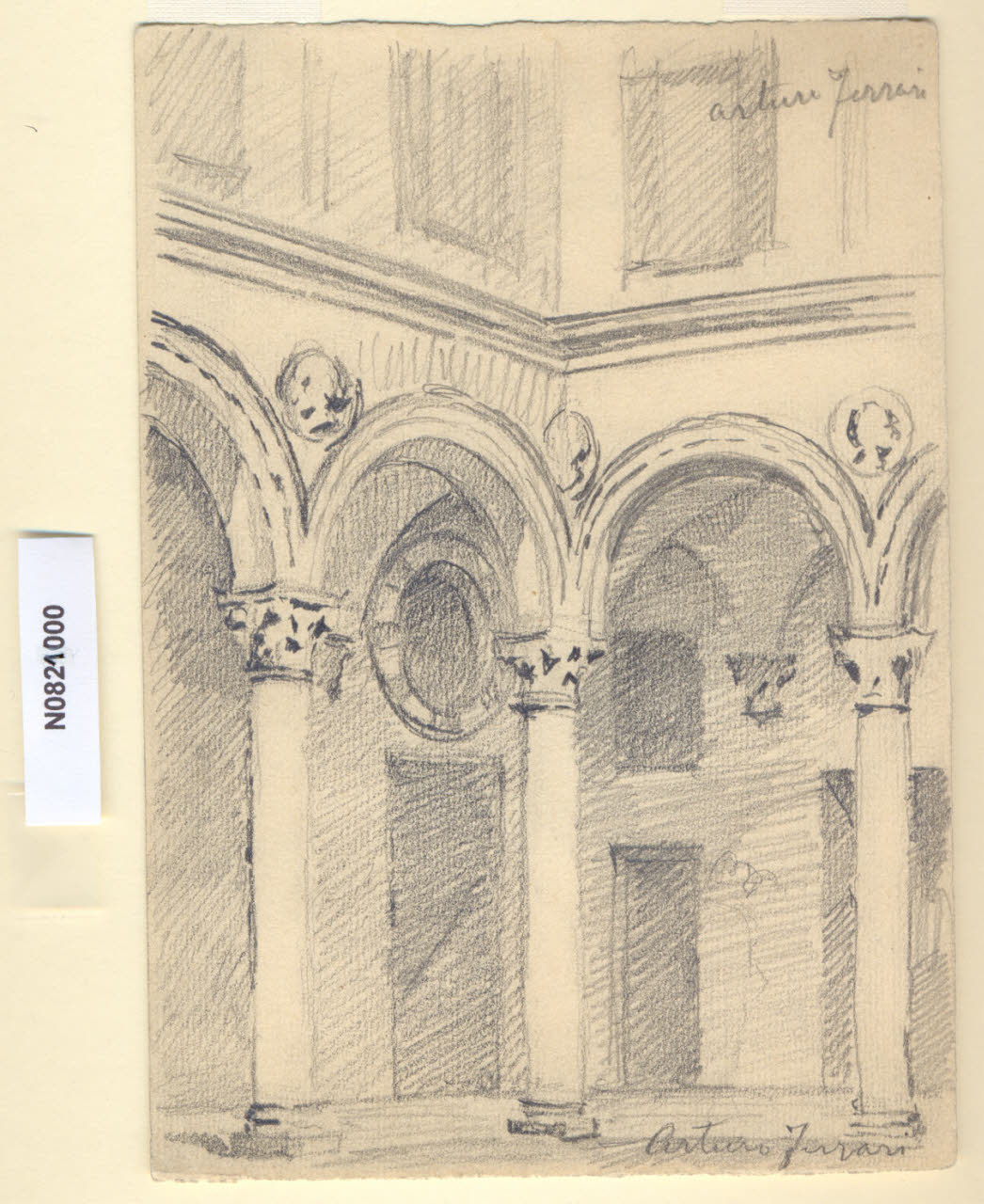 - NOTIZIE STORICO CRITICHE L'artista ha definito il disegno "In Valpetrosa" nella pagina manoscritta che accompagna il primo dei diciotto fascicoli della raccolta denominata "Vecchia Milano". Alcuni ipotizzano che questo toponimo derivi dalla presenza di macerie accumulate dopo la distruzione della città nel 1162 da parte del Barbarossa; altri rirengono che il nome provenga dagli ingenti rifiuti di scaglie di marmi dei numerosi scalpellini che lavoravano nella zona. L'ipotesi più accreditata vuole il toponimo derivante dalla corruzione medievale del termine latino "Vallum Pretorium" che indicava il fossato e la strada che cingevano l'edificio pretorile, cioè la sede amministrativa e giudiziaria della città romana. \nLa strada venne denominata anche "dei Grifi", per la presenza del palazzo, di fine del Quattrocento, della famiglia di Ambrogio Grifo, umanista e archiatra al servizio di Lodovico il Moro, molto apprezzato presso la corte sforzesca. Deturpazioni moderne hanno completamente alterato l'esterno dell'antico edificio, ma della "Casa dei Grifi" resta il cortile rettangolare al piano terreno, uno dei pochissimi rinascimentali in città, con colonne ed archi di granito e capitelli compositi in pietra di ispirazione bramantesca, attualmente ubicato al numero civico 5. Nei pennacchi degli archi sono ancora visibili teste leonine e di imperatori in tondi di pietra; lungo i muri capitelli pensili accrescono l'eleganza del portico.\nLa vedova di Ferrari, proponendo i disegni all'attenzione del Comune di Milano, riconduceva la loro realizzazione agli ultimi anni di vita del marito. Una delle opere reca la data 1926; inoltre presso il Museo di Milano si conserva un'altra serie di 16 analoghe vedute a matita di Ferrari, datate dal 1924 al 1931. Pertanto si ritiene che la serie del Civico Gabinetto dei Disegni sia stata eseguita nell'arco cronologico dal 1924 al 1932. \nIn quell'epoca Milano stava conoscendo notevoli trasformazioni urbanistiche e il pittore, per contrastare la perdita di memoria provocata dalle demolizioni, decise di fissare nei suoi disegni gli angoli e gli scorci destinati a un radicale cambiamento.