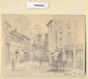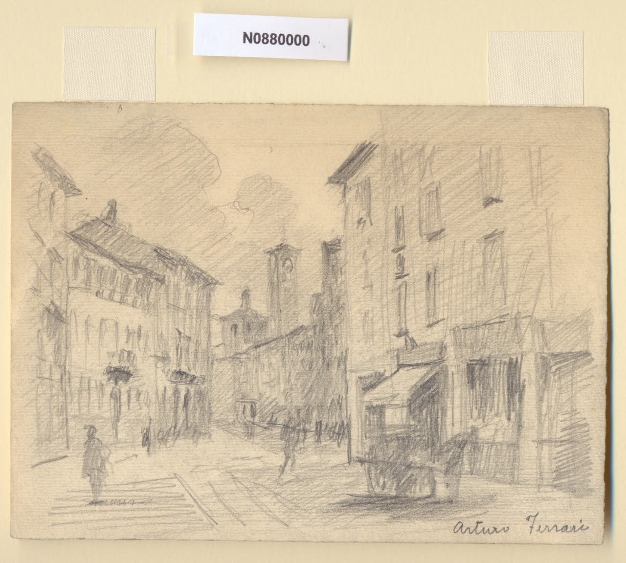 - NOTIZIE STORICO CRITICHE L'artista ha definito il disegno "Dal Bottonuto" nella pagina manoscritta che accompagna il settimo dei diciotto fascicoli della raccolta denominata "Vecchia Milano". L'attuale ubicazione del luogo è tra via Albricci e via Pantano: si tratta di una strada attualmente scomparsa. Una delle spiegazioni del nome Bottonuto è quella che derivi da un capitano tedesco, Botnuk o Boddinuk, soldato di Barbarossa che nel 1158 non riuscì ad espugnare una pusterla eretta a ridosso di estese fortificazioni; la zona fu poi così chiamata dal popolo per vantarsi dell'attacco respinto. Il nome antico di "botinucum" indica il pesciolino d'acqua dolce che suggerisce la presenza di acque; l'importante opera idraulica di convogliamento delle acque del Seveso fu infatti denominata butin-ucum. \nGrazie alla forma del suo slargo, sul quale confluivano numerose vie e vicoli, il Bottonuto ebbe un ruolo centrale nell'accogliere crocette e altaroli durante le pestilenze del Cinquecento e Seicento. Nel 1606 si elevò la crocetta del Bottonuto o di San Glicerio, dedicata al vescovo milanese attivo tra il 436 e il 438; l'obelisco di granito rosso di Baveno poggiava su quattro palle di ottone e aveva alla sommità una croce, che doveva ricordare la Passione di Cristo. Mutati i tempi e svanite le emergenze, nel XVIII secolo presso la crocetta si teneva il mercato del vino. Nel 1872 l'obelisco, privato della croce, venne trasferito all'ingresso dei Giardini Pubblici dalla parte di corso di Porta Venezia in via Marina.\nDal 1930 si pose mano allo studio del piano di risanamento del quartiere che portò alla demolizione del Bottonuto; si optò per la cancellazione dello storico luogo, mascherando i progressivi intenti speculativi con la voglia di moralizzazione e pulizia. Il risanamento del Bottonuto risultò infatti funzionale all'immissione sul mercato fondiario di un'area centrale altrimenti declassata e, nel contempo, rispose all'esigenza di concentrare in un'unica area le operazioni finanziarie e commerciali.\nE' ipotizzabile che la veduta inquadri sullo sfondo parte del mausoleo trivulziano e il campanile della basilica di San Nazaro Maggiore. \nLa vedova di Ferrari, proponendo i disegni all'attenzione del Comune di Milano, riconduceva la loro realizzazione agli ultimi anni di vita del marito. Una delle opere reca la data 1926; inoltre presso il Museo di Milano si conserva un'altra serie di 16 analoghe vedute a matita di Ferrari, datate dal 1924 al 1931. Pertanto si ritiene che la serie del Civico Gabinetto dei Disegni sia stata eseguita nell'arco cronologico dal 1924 al 1932. \nIn quell'epoca Milano stava conoscendo notevoli trasformazioni urbanistiche e il pittore, per contrastare la perdita di memoria provocata dalle demolizioni, decise di fissare nei suoi disegni gli angoli e gli scorci destinati a un radicale cambiamento.