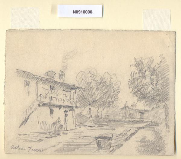 - NOTIZIE STORICO CRITICHE L'artista ha definito il disegno "Al Molinazzo" nella pagina manoscritta che accompagna il decimo dei diciotto fascicoli della raccolta denominata "Vecchia Milano". Ugo Nebbia (in "Milano che sfugge", Milano, 1909) descrive il Molinazzo come un aggregato di vecchie abitazioni rurali disposte entro una cinta rettangolare di fabbricati minori e lo colloca fuori Porta Magenta; aggiunge inoltre che il nucleo principale della cascina era contrassegnato dalla presenza di una torre risalente al XIV secolo e dell'antichità del luogo era testimone un piccolo oratorio che si ergeva isolato accanto all'edificio principale. Wolfango Pinardi (in "I Corpi Santi di Porta Vercellina a Milano", Milano, 1966) riporta che fuori Porta Vercellina esisteva la piccola dei chiesa dei santi Filippo e Donato al Molinazzo, l'edificio nel 1950 circa era quasi isolato, c'erano nei pressi solo un vecchio cascinale e campi tagliati da canali d'acqua; il cascinale vicino alla chiesetta era anch'esso chiamato il Molinazzo, poichè in passato aveva un mulino, la cui macina era mossa dalle acque del canale Restocco, poi coperto. Si può ipotizzare che la descrizione offerta dal Pinardi corrisponda al luogo raffigurato dal Ferrari, ma non sono possibili riscontri certi poichè la zona risulta oggi irrimediabilmente trasformata. \nLa vedova di Ferrari, proponendo i disegni all'attenzione del Comune di Milano, riconduceva la loro realizzazione agli ultimi anni di vita del marito. Una delle opere reca la data 1926; inoltre presso il Museo di Milano si conserva un'altra serie di 16 analoghe vedute a matita di Ferrari, datate dal 1924 al 1931. Pertanto si ritiene che la serie del Civico Gabinetto dei Disegni sia stata eseguita nell'arco cronologico dal 1924 al 1932. \nIn quell'epoca Milano stava conoscendo notevoli trasformazioni urbanistiche e il pittore, per contrastare la perdita di memoria provocata dalle demolizioni, decise di fissare nei suoi disegni gli angoli e gli scorci destinati a un radicale cambiamento.
