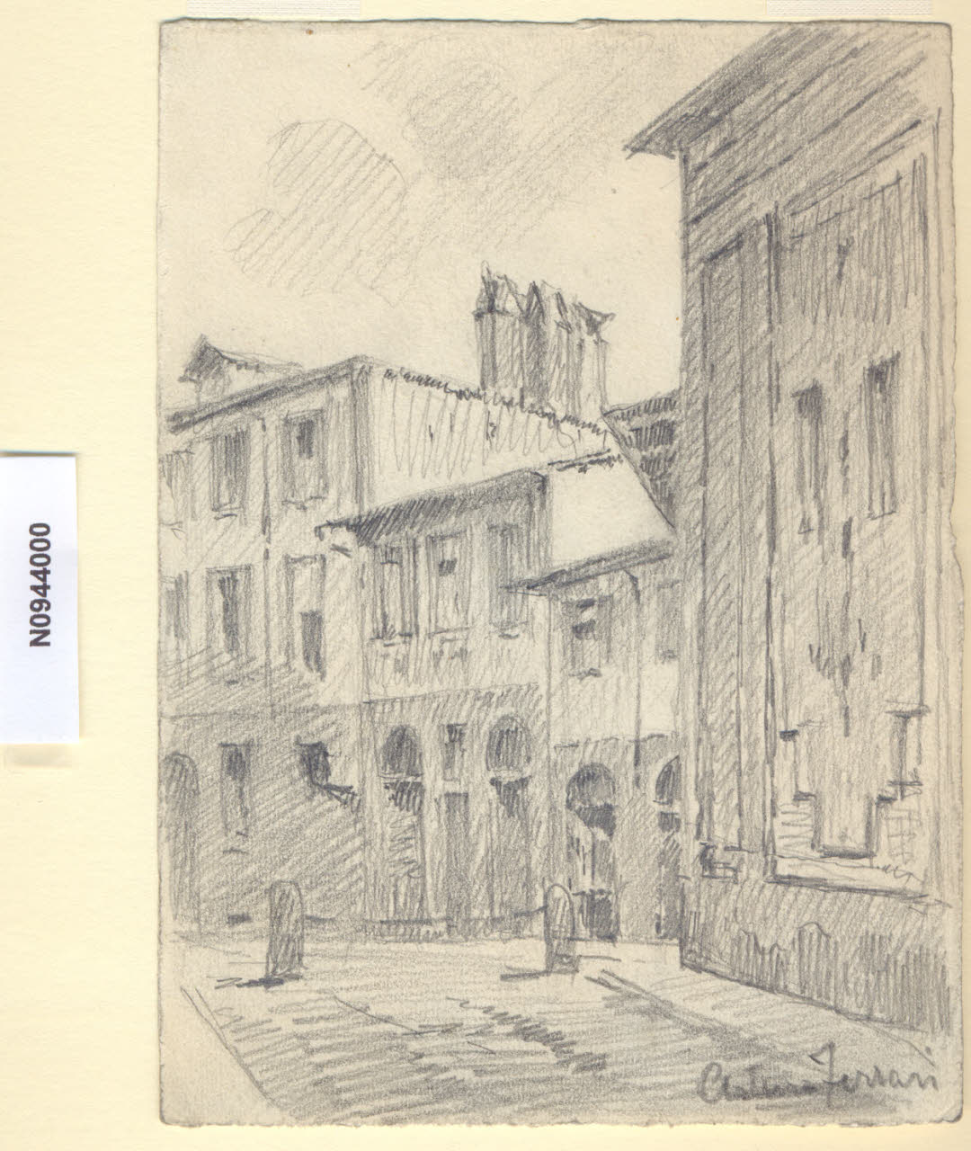 - NOTIZIE STORICO CRITICHE L'artista ha definito il disegno "Via S Bernardino" nella pagina manoscritta che accompagna il tredicesimo dei diciotto fascicoli della raccolta denominata "Vecchia Milano". Nella via è attualmente ubicata la chiesa di San Bernardino dei Morti, la cui edificazione risale al 1127 quando, per munificenza del nobile milanese Gotifredo Bussero, venne progettato un ospedale per lebbrosi vicino alla Basilica di Santo Stefano (nell'odierna via Brolo). Davanti alla basilica fu costruito un apposito cimitero per seppellirvi coloro che morivano nell'ospedale. Nel 1210 in fondo al cimitero venne eretta una camera per riunire le ossa esumate dal cimitero stesso. Nel 1268, sotto il pontificato di Clemente IV, fu edificata, vicino all'ossario, una piccola chiesa dedicata alla Passione di Maria Vergine e ai santi Sebastiano e Ambrogio. Nel 1430 venne concesso alla confraternita laica dei Disciplini di costruire un proprio oratorio, per le riunionie le funzioni religiose, sopra la chiesa del cimitero. \nNel 1642 crollò rovinosamente il campanile della Basilica di Santo Stefano, travolgendo la chiesa di San Bernardino e anche l'ossario; la chiesa venne subito ricostruita e nel 1679 venne rifatta la facciata, secondo un progetto di Giovanni Andrea Biffi che ideò un prospetto a tre ordini. Dal 1690 si riprese anche la costruzione dell'ossario, a pianta rettangolare coperta da un'alta volta, e le pareti vennero decorate con teschi e tibie umane, confacenti ai tempi di pestilenze e carestie; i lavori terminarono nel 1695 con gli affreschi della cupola e dei pennacchi da parte del veneto Sebastiano Ricci. La crescita dell'affluenza dei fedeli a questo nuovo ossario fu tale che, nel 1750 secondo il progetto dell'architetto Carlo Giuseppe Merlo, che prevedeva un edificio a pianta ottagonale sormontato da una cupola traforata da otto finestre ovali corrispondenti a quelle esterne dell'alto tiburio, si decise di costruire una chiesa adiacente più ampia, cioè l'attuale chiesa di San Bernardino, servendosi della vecchia chiesetta dei Disciplini come atrio della nuova. Da quel momento santo patrono venne scelto San Bernardino da Siena e la chiesa venne chiamata San Bernardino dei Morti o San Bernardino alle Ossa.\nLa vedova di Ferrari, proponendo i disegni all'attenzione del Comune di Milano, riconduceva la loro realizzazione agli ultimi anni di vita del marito. Una delle opere reca la data 1926; inoltre presso il Museo di Milano si conserva un'altra serie di 16 analoghe vedute a matita di Ferrari, datate dal 1924 al 1931. Pertanto si ritiene che la serie del Civico Gabinetto dei Disegni sia stata eseguita nell'arco cronologico dal 1924 al 1932. \nIn quell'epoca Milano stava conoscendo notevoli trasformazioni urbanistiche e il pittore, per contrastare la perdita di memoria provocata dalle demolizioni, decise di fissare nei suoi disegni gli angoli e gli scorci destinati a un radicale cambiamento.