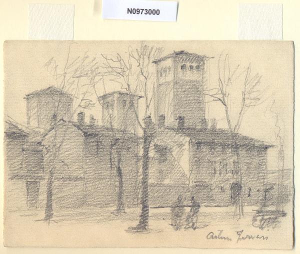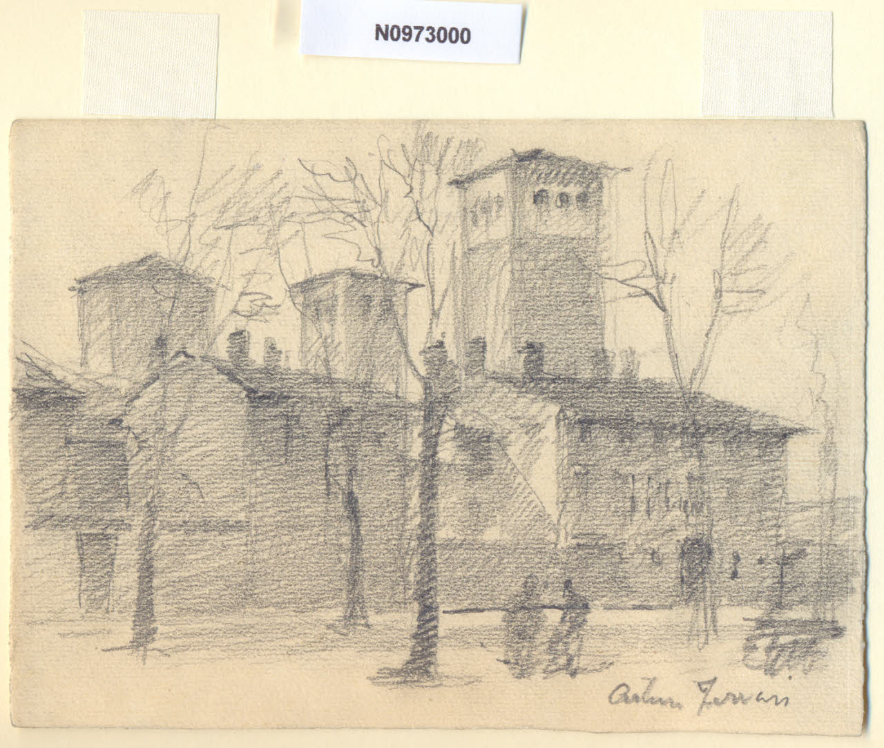 - NOTIZIE STORICO CRITICHE L'artista ha definito il disegno "S Ambrogio" nella pagina manoscritta che accompagna il sedicesimo dei diciotto fascicoli della raccolta denominata "Vecchia Milano". La "Basilica Martirum", consacrata il 19 gennaio del 386 e fondata da Sant'Ambrogio, fu eretta sul luogo di sepoltura dei santi Gervasio e Protasio, nella zona cimiteriale che nel IV secolo accolse le spoglie dei primi martiri della fede. La basilica paleocristiana, con navata centrale doppia rispetto alle laterali, aveva un'unica abside semicircolare. Nell'830 l'edificio fu ampliato per volere dell'arcivescovo Angilberto II e consacrato a Sant'Ambrogio, aggiungendovi l'attuale atrio angolare preposto all'accoglienza di pellegrini e penitenti. Nella veduta, dietro agli alberi spogliati dai rigori invernali, spiccano i campanili della basilica, quello "dei canonici", più slanciato (rialzato nel 1889), e quello "dei monaci", sul lato opposto.\nLa vedova di Ferrari, proponendo i disegni all'attenzione del Comune di Milano, riconduceva la loro realizzazione agli ultimi anni di vita del marito. Una delle opere reca la data 1926; inoltre presso il Museo di Milano si conserva un'altra serie di 16 analoghe vedute a matita di Ferrari, datate dal 1924 al 1931. Pertanto si ritiene che la serie del Civico Gabinetto dei Disegni sia stata eseguita nell'arco cronologico dal 1924 al 1932.
