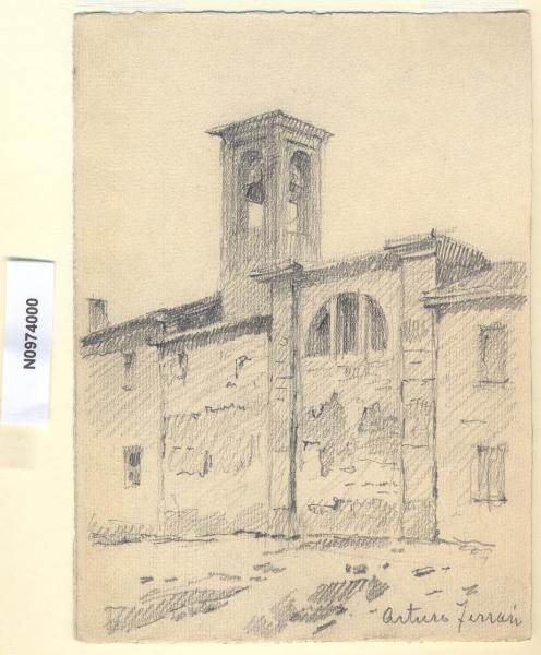 - NOTIZIE STORICO CRITICHE L'artista ha definito il disegno "Gentilino" nella pagina manoscritta che accompagna il sedicesimo dei diciotto fascicoli della raccolta denominata "Vecchia Milano". Il Gentilino era un cimitero locale, fuori dalle mura spagnole, fra Porta Ludovica e Porta Ticinese; il vecchio foppone intitolato a san Rocco era tristemente famoso per essere stato allestito in grande fretta durante la pestilenza del 1576. \nNel 1787 venne aperto un nuovo cimitero, con l'obiettivo d'espansione e riqualificazione del vicino e antico cimitero di San Rocco al Gentilino. La nuova struttura di forma rettangolare era identificabile nel quadrilatero oggi compreso tra le vie Tantardini, Tabacchi, Balilla, Baravalle.\nVenne aperto in fretta e con pochissimo dispendio di denaro, tanto che a lavori ultimati il nuovo cimitero appariva tremendamente squallido e privo di qualsivoglia elemento artistico o decorativo. La scarsa qualità dei materiali edili e i lavori in economia costrinsero peraltro la municipalità ad intervenire più volte con lavori di straordinaria manutenzione. Solo nel 1820 iniziarono ad essere elevate alcune cappelle per sepolture di famiglia e ordini religiosi, che col tempo divennero sedici. La chiesetta annessa venne abbellita nel 1830, e successivamente si tracciarono alcuni vialetti interni. Dopo il 1867 iniziarono, chiusure a singhiozzo, anche a causa delle lamentele avanzate dagli abitanti delle case, sempre più vicine e costruite senza il mantenimento delle aree di rispetto contigue.\nAlcune interruzioni temporanee furono dovute alle epidemie di colera, e a quella vaiolosa del 1888-1889. Venne definitivamente soppresso il 22 ottobre 1895, e subito iniziò lo svuotamento delle fosse, con trasporto dei cadaveri presso il nuovo cimitero di Musocco. \nLa chiesa di san Rocco al Gentilino è attualmente ubicata in piazza Tito Lucrezio Caro, ma risulta ricostruita in chiave moderna rispetto all'edificio raffigurato dal Ferrari.\nA Milano esistevano numerosi oratori, spesso posti vicino alle porte cittadine, e un'altra chiesa cimiteriale (San Rocco a Porta Romana, inv. 831) dedicati a San Rocco, protettore dalle epidemie e dalla peste.\nLa vedova di Ferrari, proponendo i disegni all'attenzione del Comune di Milano, riconduceva la loro realizzazione agli ultimi anni di vita del marito. Una delle opere reca la data 1926; inoltre presso il Museo di Milano si conserva un'altra serie di 16 analoghe vedute a matita di Ferrari, datate dal 1924 al 1931. Pertanto si ritiene che la serie del Civico Gabinetto dei Disegni sia stata eseguita nell'arco cronologico dal 1924 al 1932. \nIn quell'epoca Milano stava conoscendo notevoli trasformazioni urbanistiche e il pittore, per contrastare la perdita di memoria provocata dalle demolizioni, decise di fissare nei suoi disegni gli angoli e gli scorci destinati a un radicale cambiamento.