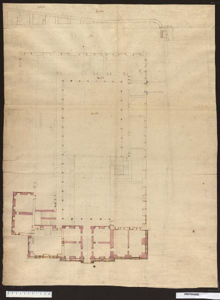 - NOTIZIE STORICO CRITICHE Nella "Spiegazione de numeri" del tomo nel quale era rilegato il disegno viene definito: "Pianta del Zulis, nella quale si accennano de' risarcimenti alla facciata del cortile".\nIl disegno si ritiene autografo di Zuccalli, per la grafia simile a quella della planimetria generale firmata.\nSi tratta di una pianta del piano terreno del castello con il dettaglio degli interventi da realizzare nell'ala est e sud-est, evidenziati con acquarello rosso.\nIl vecchio castello presentava in questo lato un andamento irregolare, non essendo stato probabilmente interessato dagli interventi rinascimentali e non aveva ambienti di rilievo nei pressi dell'ingresso oltre il quale si ergeva il porticato, interrotto da una sporgenza di muratura nella sua prosecuzione lungo il lato sud (grafico in Domenico Martinelli, 2006, p. 65).\nZuccalli regolarizza questa parte, introducendo nell'angolo interno verso il cortile a sud est lo scalone e attaccandovi il corpo regolare che avrebbe dovuto costituire il nuovo fronte est. Il porticato riacquista così la continuità intorno al cortile fino alla torre.\nIn quest'ala rinnovata dovevano trovare posto, a piano terra, il vestibolo d'ingresso affiancato da quattro locali disposti simmetricamente rispetto ad esso e altre stanze di forma regolare adiacenti; al piano nobile, probabilmente una grande sala con appartamenti annessi, che avrebbero dovuto essere riccamente e comodamente arredati.\nDa notare la doppia muratura in facciata, acquerellata in colore bruno e grigio, che indica lo zoccolo sporgente dell'edificio. Oltre il fossato a ovest sono segnate le strutture di sostegno della scarpata. Nella parte restante del disegno, solo accennata a matita, si distingue da un lato il completamento dei lati lunghi del castello e dall'altro una soluzione per il cortile molto simile all'ipotesi in seguito avanzata da Martinelli, che indica la duplicazione simmetrica del corpo della torre (o comunque la creazione di un vano scala di uguale forma e dimensioni), l'ingrossamento del corpo sud-est per riprendere la profondità di quello a nord-est e accenna a un ulteriore prolungamento in avanti del fronte est. Sono inoltre tracciate delle croci di elisione, sempre a matita su alcune parti del disegno di Zuccalli. Potrebbe quindi trattarsi di "correzioni" successive di Martinelli sulla pianta di Zuccalli (ipotesi avanzata anche da Hubala, 1957 p. 181).