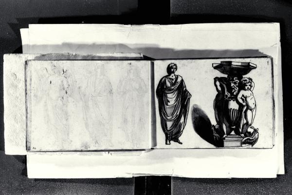 Figura maschile togata e piedistallo di un bacile con mascherone, putti e delfini