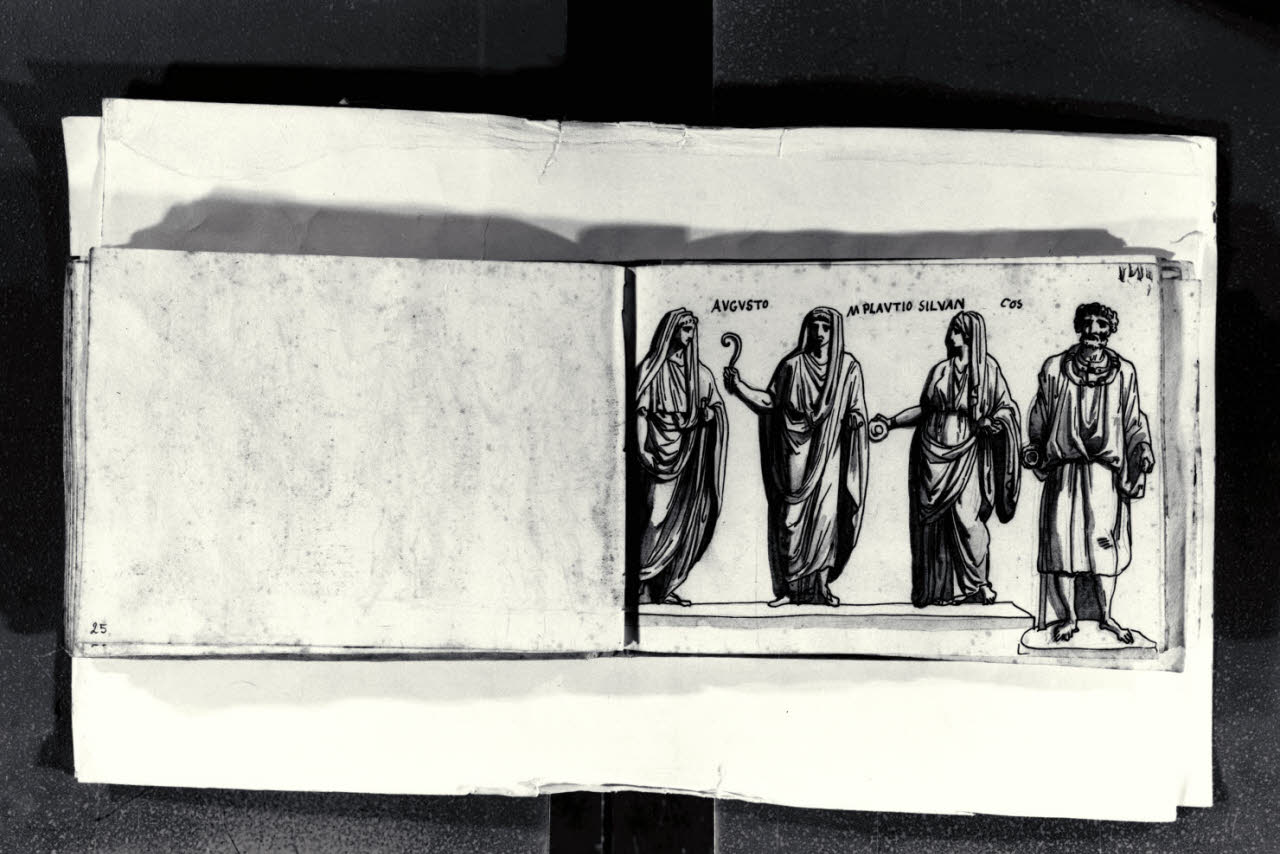 Rilievo della fronte dell'altare dei Lari Augusti (Uffizi, già collezione Villa Medici) e figura maschile stante
