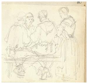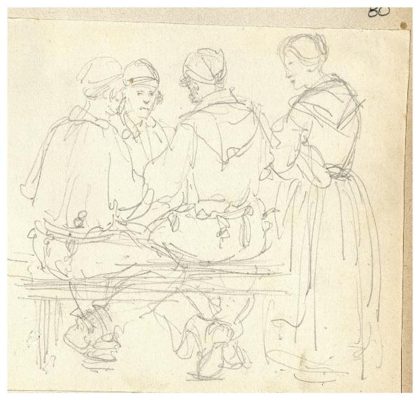 Figure intorno ad un tavolo e donna in piedi