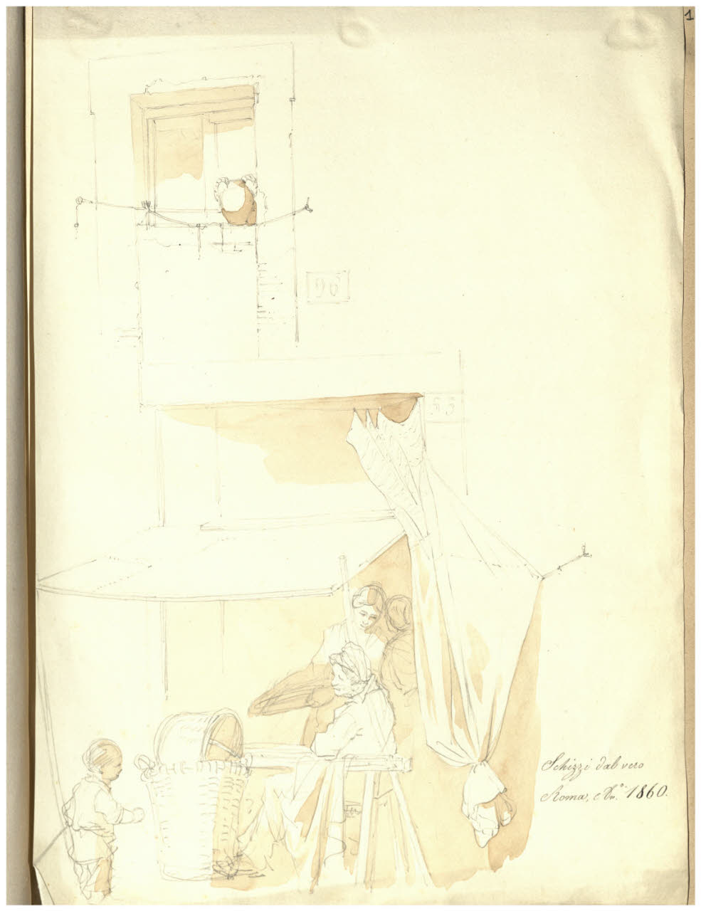 Esterno di casa con popolane (Schizzi dal vero Roma 1860)