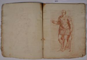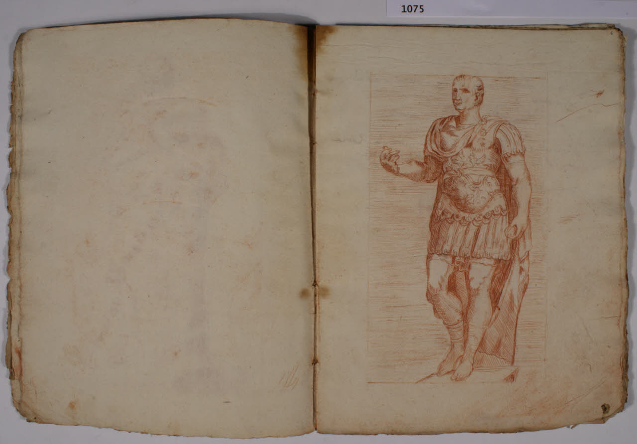 - NOTIZIE STORICO CRITICHE L'album, costituito da disegni di copia a matita rossa, riproduce alcune delle incisioni, con sculture dell'antichità, realizzate da François Perrier (1594-1650) e raccolte nella serie di cento tavole "Segmenta nobilium signorum et statuarum", data alle stampe per la prima volta a Roma nel 1638 e oggi nota in più edizioni, anche di anni successivi (sulla serie incisoria: S. Laveissière, "L'antique selon François Perrier: les Segmenta nobilium Signorum et leurs modèles", in "Poussin et la construction de l'antique", 2011, pp. 49-151). \nIl foglio in analisi riproduce l'incisione (tavola 9) con "Giulio Cesare" dei Musei Capitolini di Roma.