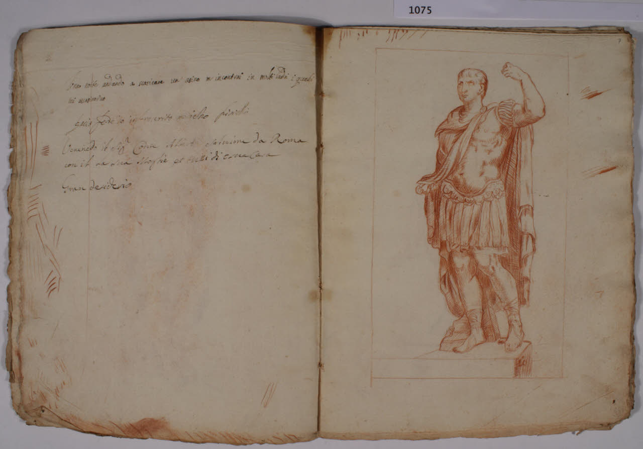 - NOTIZIE STORICO CRITICHE L'album, costituito da disegni di copia a matita rossa, riproduce alcune delle incisioni, con sculture dell'antichità, realizzate da François Perrier (1594-1650) e raccolte nella serie di cento tavole "Segmenta nobilium signorum et statuarum", data alle stampe per la prima volta a Roma nel 1638 e oggi nota in più edizioni, anche di anni successivi (sulla serie incisoria: S. Laveissière, "L'antique selon François Perrier: les Segmenta nobilium Signorum et leurs modèles", in "Poussin et la construction de l'antique", 2011, pp. 49-151). \nIl foglio in analisi riproduce l'incisione (tavola 10) con "Ottaviano Augusto" dei Musei Capitolini di Roma.