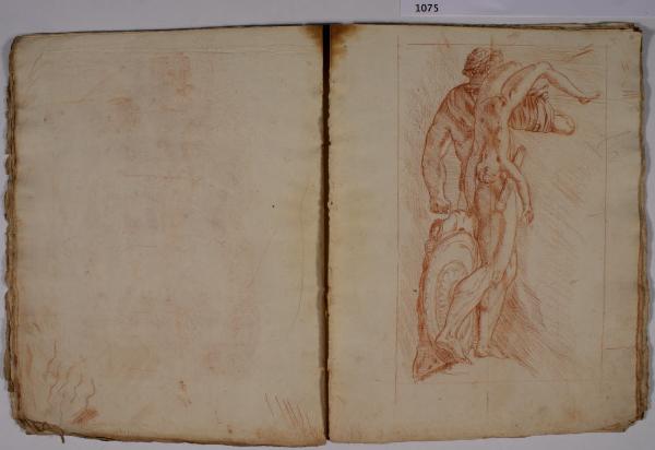 - NOTIZIE STORICO CRITICHE L'album, costituito da disegni di copia a matita rossa, riproduce alcune delle incisioni, con sculture dell'antichità, realizzate da François Perrier (1594-1650) e raccolte nella serie di cento tavole "Segmenta nobilium signorum et statuarum", data alle stampe per la prima volta a Roma nel 1638 e oggi nota in più edizioni, anche di anni successivi (sulla serie incisoria: S. Laveissière, "L'antique selon François Perrier: les Segmenta nobilium Signorum et leurs modèles", in "Poussin et la construction de l'antique", 2011, pp. 49-151). \nIl foglio in analisi riproduce l'incisione (tavola 13) con "Commodo gladiatore (Eroe greco con fanciullo)" del Museo Archeologico Nazionale di Napoli.