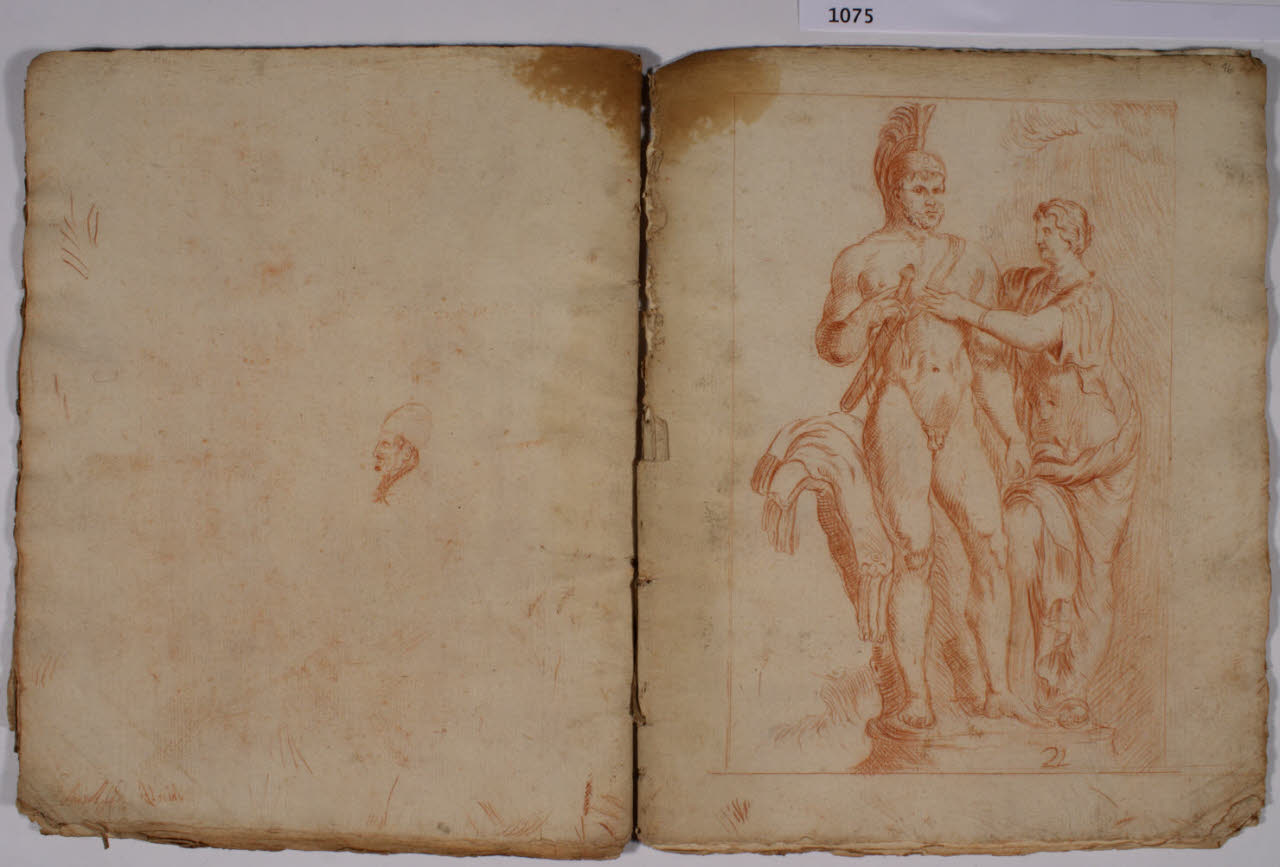 - NOTIZIE STORICO CRITICHE L'album, costituito da disegni di copia a matita rossa, riproduce alcune delle incisioni, con sculture dell'antichità, realizzate da François Perrier (1594-1650) e raccolte nella serie di cento tavole "Segmenta nobilium signorum et statuarum", data alle stampe per la prima volta a Roma nel 1638 e oggi nota in più edizioni, anche di anni successivi (sulla serie incisoria: S. Laveissière, "L'antique selon François Perrier: les Segmenta nobilium Signorum et leurs modèles", in "Poussin et la construction de l'antique", 2011, pp. 49-151). \nIl foglio in analisi riproduce l'incisione (tavola 21) con "Marte e Venere" del Museo del Louvre di Parigi.