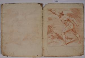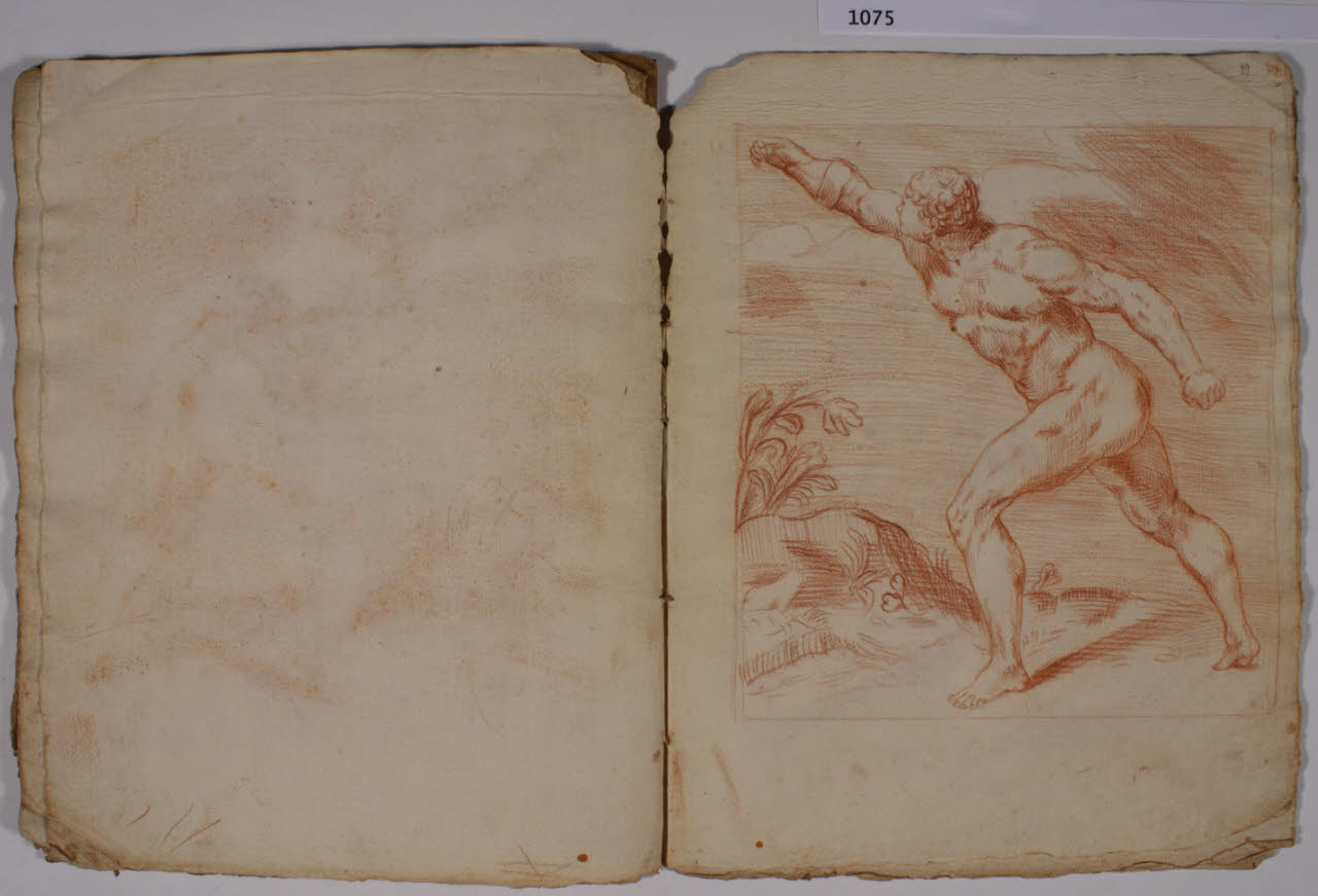 - NOTIZIE STORICO CRITICHE L'album, costituito da disegni di copia a matita rossa, riproduce alcune delle incisioni, con sculture dell'antichità, realizzate da François Perrier (1594-1650) e raccolte nella serie di cento tavole "Segmenta nobilium signorum et statuarum", data alle stampe per la prima volta a Roma nel 1638 e oggi nota in più edizioni, anche di anni successivi (sulla serie incisoria: S. Laveissière, "L'antique selon François Perrier: les Segmenta nobilium Signorum et leurs modèles", in "Poussin et la construction de l'antique", 2011, pp. 49-151). \nIl foglio in analisi riproduce l'incisione (tavola 27) con "Gladiatore Borghese" del Museo del Louvre di Parigi.