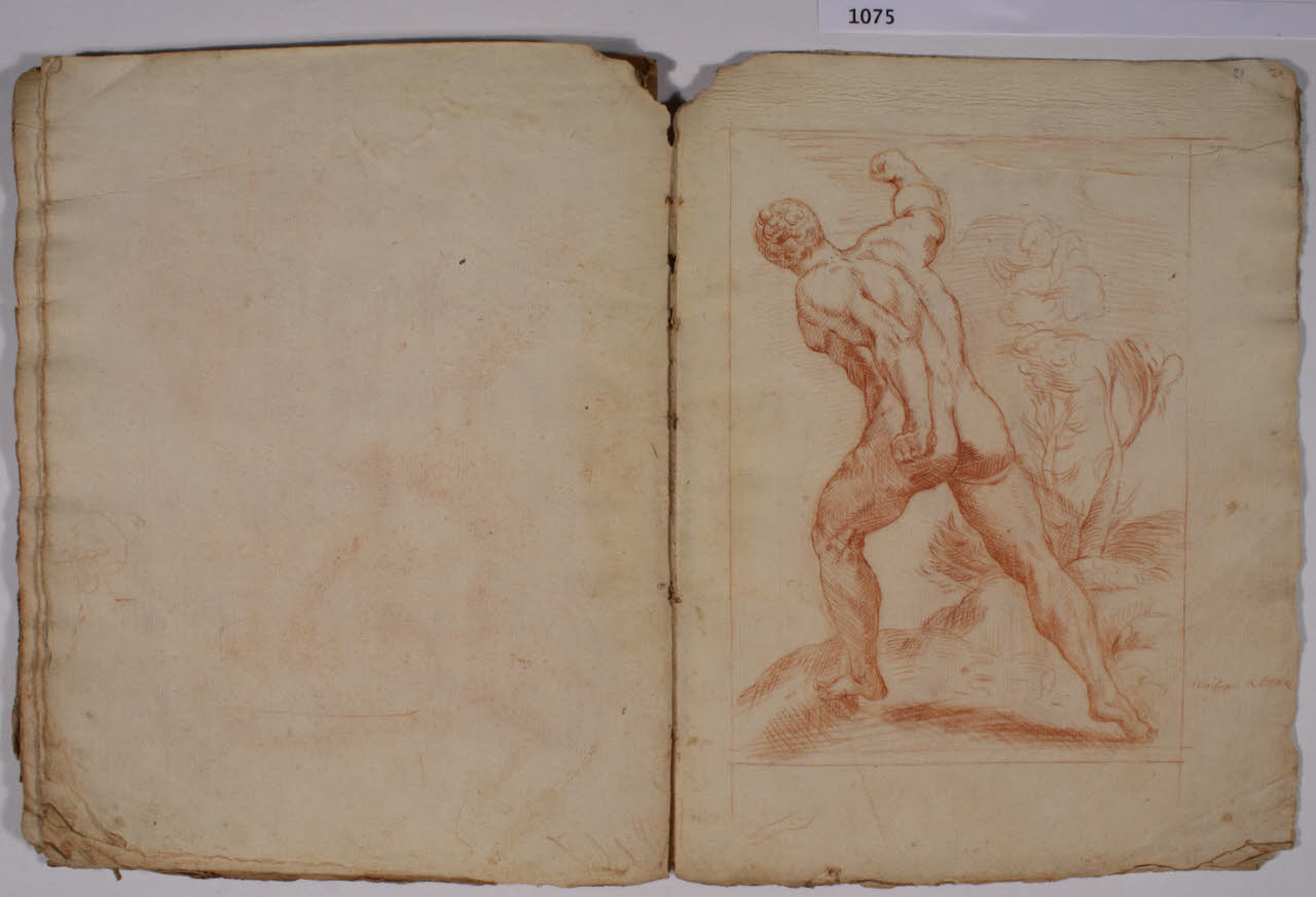 - NOTIZIE STORICO CRITICHE L'album, costituito da disegni di copia a matita rossa, riproduce alcune delle incisioni, con sculture dell'antichità, realizzate da François Perrier (1594-1650) e raccolte nella serie di cento tavole "Segmenta nobilium signorum et statuarum", data alle stampe per la prima volta a Roma nel 1638 e oggi nota in più edizioni, anche di anni successivi (sulla serie incisoria: S. Laveissière, "L'antique selon François Perrier: les Segmenta nobilium Signorum et leurs modèles", in "Poussin et la construction de l'antique", 2011, pp. 49-151). \nIl foglio in analisi riproduce l'incisione (tavola 29) con "Gladiatore Borghese" del Museo del Louvre di Parigi. Il foglio mostra un'iscrizione poco leggibile. Al verso sono presenti tre piccoli schizzi, uno di un volto, uno cancellato e uno di un occhio.
