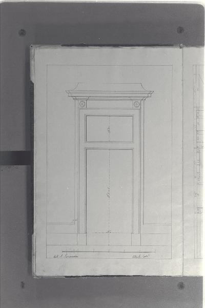 - NOTIZIE STORICO CRITICHE Il cosiddetto "Album Piermarini" è un taccuino di particolari e note, un fascicolo di 58 fogli (116 pagine) che raccoglie disegni e scritti riferiti a opere di Piermarini, Pellegrini, Segrè, Richino e Giocondo Albertolli; di questi, probabilmente nessuno è autografo di Piermarini. La sua impaginazione, la tecnica disegnativa impiegata in gran parte dei fogli e l'aspetto grafico sembrano quelli preparatori a incisioni per una pubblicazione: secondo parte della critica, potrebbe trattarsi di una bozza, redatta da un collaboratore (forse Marcellino Segrè), al fine di farne un manuale a uso dell'Accademia di Belle Arti. L'album è una copia del secondo dei due Zibaldoni di Giuseppe Piermarini, conservati presso la Biblioteca Comunale di Foligno con il titolo "Libro di appunti, ricordi, disegni vari".\nIl foglio illustra il prospetto di una porta per il Palazzo Reale di Milano (ex Palazzo di Corte), su progetto del Piermarini.