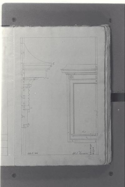 - NOTIZIE STORICO CRITICHE Il cosiddetto "Album Piermarini" è un taccuino di particolari e note, un fascicolo di 58 fogli (116 pagine) che raccoglie disegni e scritti riferiti a opere di Piermarini, Pellegrini, Segrè, Richino e Giocondo Albertolli; di questi, probabilmente nessuno è autografo di Piermarini. La sua impaginazione, la tecnica disegnativa impiegata in gran parte dei fogli e l'aspetto grafico sembrano quelli preparatori a incisioni per una pubblicazione: secondo parte della critica, potrebbe trattarsi di una bozza, redatta da un collaboratore (forse Marcellino Segrè), al fine di farne un manuale a uso dell'Accademia di Belle Arti. L'album è una copia del secondo dei due Zibaldoni di Giuseppe Piermarini, conservati presso la Biblioteca Comunale di Foligno con il titolo "Libro di appunti, ricordi, disegni vari".\nIl foglio illustra dettagli architettonici del Palazzo Reale di Milano (ex Palazzo di Corte), su progetto del Piermarini.