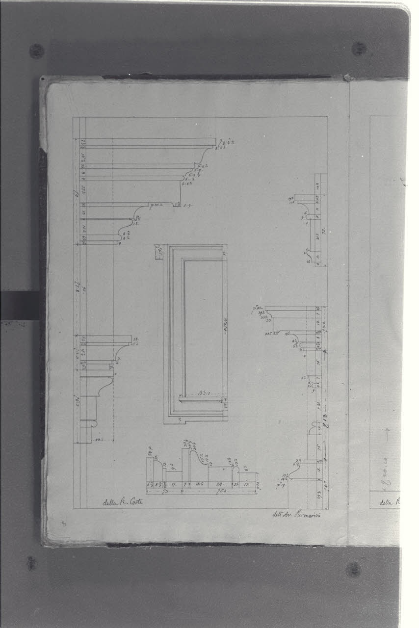 • NOTIZIE STORICO CRITICHE Il cosiddetto "Album Piermarini" è un taccuino di particolari e note, un fascicolo di 58 fogli (116 pagine) che raccoglie disegni e scritti riferiti a opere di Piermarini, Pellegrini, Segrè, Richino e Giocondo Albertolli; di questi, probabilmente nessuno è autografo di Piermarini. La sua impaginazione, la tecnica disegnativa impiegata in gran parte dei fogli e l'aspetto grafico sembrano quelli preparatori a incisioni per una pubblicazione: secondo parte della critica, potrebbe trattarsi di una bozza, redatta da un collaboratore (forse Marcellino Segrè), al fine di farne un manuale a uso dell'Accademia di Belle Arti. L'album è una copia del secondo dei due Zibaldoni di Giuseppe Piermarini, conservati presso la Biblioteca Comunale di Foligno con il titolo "Libro di appunti, ricordi, disegni vari".\nIl foglio mostra dettagli architettonici per il Palazzo Reale di Milano (ex Palazzo di Corte), su progetto del Piermarini.