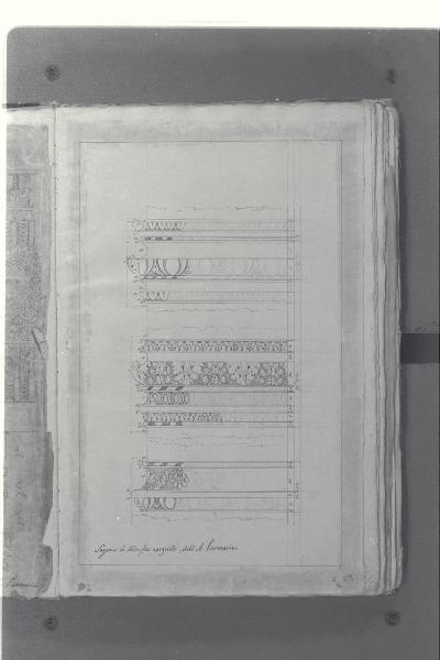 - NOTIZIE STORICO CRITICHE Il cosiddetto "Album Piermarini" è un taccuino di particolari e note, un fascicolo di 58 fogli (116 pagine) che raccoglie disegni e scritti riferiti a opere di Piermarini, Pellegrini, Segrè, Richino e Giocondo Albertolli; di questi, probabilmente nessuno è autografo di Piermarini. La sua impaginazione, la tecnica disegnativa impiegata in gran parte dei fogli e l'aspetto grafico sembrano quelli preparatori a incisioni per una pubblicazione: secondo parte della critica, potrebbe trattarsi di una bozza, redatta da un collaboratore (forse Marcellino Segrè), al fine di farne un manuale a uso dell'Accademia di Belle Arti. L'album è una copia del secondo dei due Zibaldoni di Giuseppe Piermarini, conservati presso la Biblioteca Comunale di Foligno con il titolo "Libro di appunti, ricordi, disegni vari".\nIl foglio mostra, sin dalla didascalia, tangenze di linguaggio tra Piermarini e Albertolli.