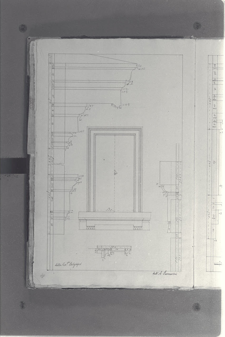 - NOTIZIE STORICO CRITICHE Il cosiddetto "Album Piermarini" è un taccuino di particolari e note, un fascicolo di 58 fogli (116 pagine) che raccoglie disegni e scritti riferiti a opere di Piermarini, Pellegrini, Segrè, Richino e Giocondo Albertolli; di questi, probabilmente nessuno è autografo di Piermarini. La sua impaginazione, la tecnica disegnativa impiegata in gran parte dei fogli e l'aspetto grafico sembrano quelli preparatori a incisioni per una pubblicazione: secondo parte della critica, potrebbe trattarsi di una bozza, redatta da un collaboratore (forse Marcellino Segrè), al fine di farne un manuale a uso dell'Accademia di Belle Arti. L'album è una copia del secondo dei due Zibaldoni di Giuseppe Piermarini, conservati presso la Biblioteca Comunale di Foligno con il titolo "Libro di appunti, ricordi, disegni vari".\nIl foglio illustra una finestra e alcuni dettagli architettonici di Palazzo Belgiojoso a Milano, su progetto del Piermarini.