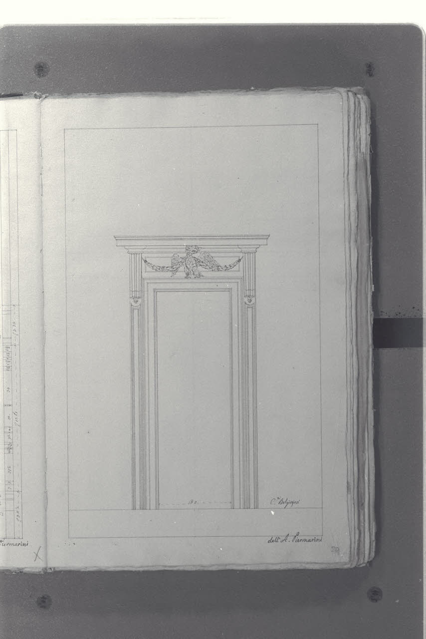 - NOTIZIE STORICO CRITICHE Il cosiddetto "Album Piermarini" è un taccuino di particolari e note, un fascicolo di 58 fogli (116 pagine) che raccoglie disegni e scritti riferiti a opere di Piermarini, Pellegrini, Segrè, Richino e Giocondo Albertolli; di questi, probabilmente nessuno è autografo di Piermarini. La sua impaginazione, la tecnica disegnativa impiegata in gran parte dei fogli e l'aspetto grafico sembrano quelli preparatori a incisioni per una pubblicazione: secondo parte della critica, potrebbe trattarsi di una bozza, redatta da un collaboratore (forse Marcellino Segrè), al fine di farne un manuale a uso dell'Accademia di Belle Arti. L'album è una copia del secondo dei due Zibaldoni di Giuseppe Piermarini, conservati presso la Biblioteca Comunale di Foligno con il titolo "Libro di appunti, ricordi, disegni vari".\nIl foglio mostra il rilievo di una porta di Palazzo Belgioioso d'Este a Milano, su progetto del Piermarini.