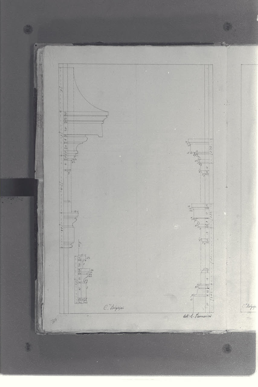 - NOTIZIE STORICO CRITICHE Il cosiddetto "Album Piermarini" è un taccuino di particolari e note, un fascicolo di 58 fogli (116 pagine) che raccoglie disegni e scritti riferiti a opere di Piermarini, Pellegrini, Segrè, Richino e Giocondo Albertolli; di questi, probabilmente nessuno è autografo di Piermarini. La sua impaginazione, la tecnica disegnativa impiegata in gran parte dei fogli e l'aspetto grafico sembrano quelli preparatori a incisioni per una pubblicazione: secondo parte della critica, potrebbe trattarsi di una bozza, redatta da un collaboratore (forse Marcellino Segrè), al fine di farne un manuale a uso dell'Accademia di Belle Arti. L'album è una copia del secondo dei due Zibaldoni di Giuseppe Piermarini, conservati presso la Biblioteca Comunale di Foligno con il titolo "Libro di appunti, ricordi, disegni vari".\nIl foglio mostra i dettagli architettonici di un muro di Palazzo Belgioioso d'Este a Milano, su progetto del Piermarini.