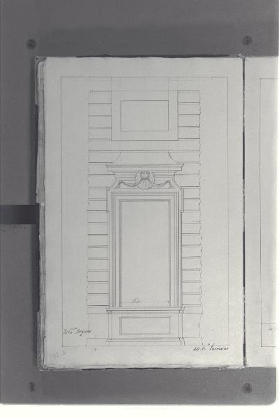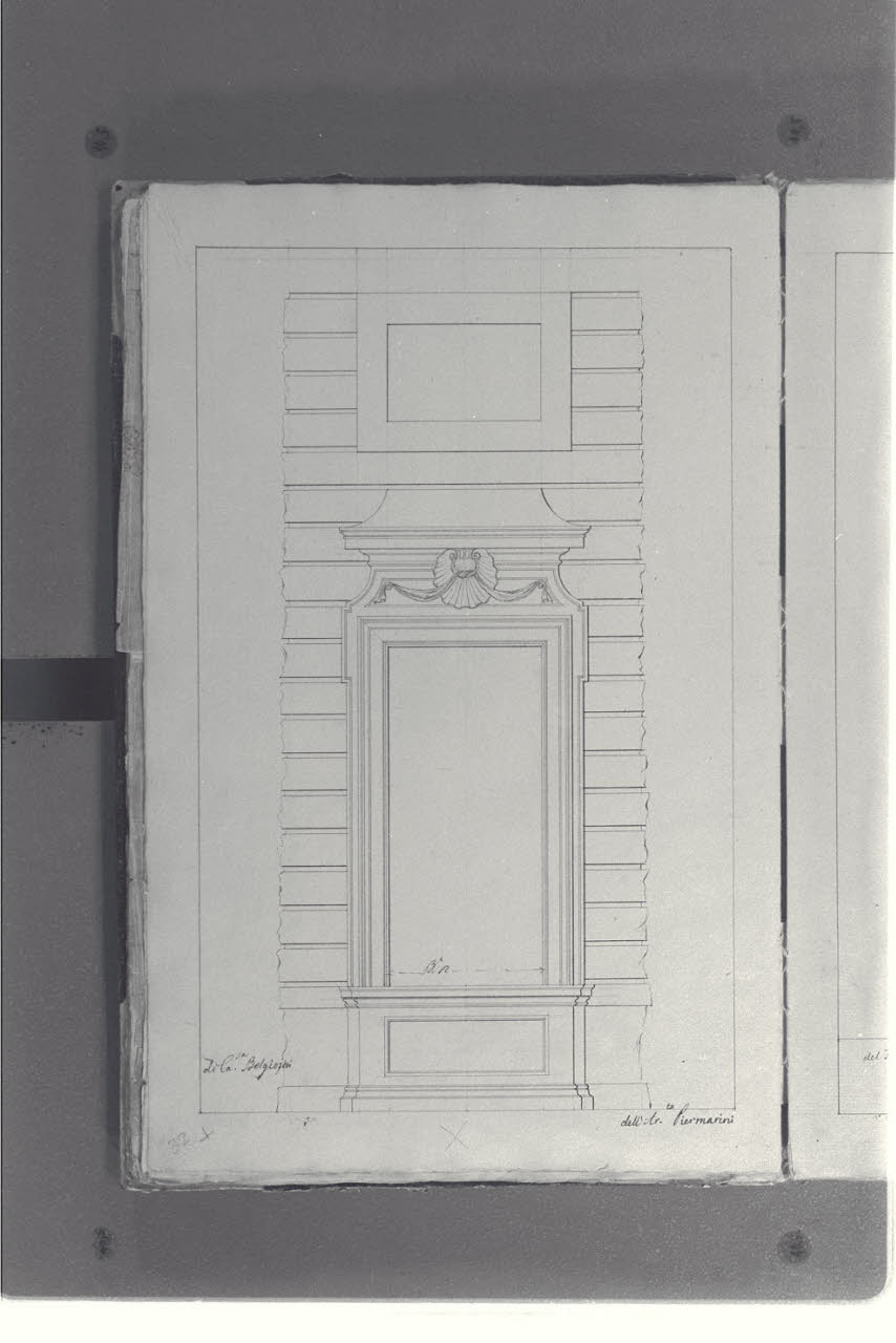 - NOTIZIE STORICO CRITICHE Il cosiddetto "Album Piermarini" è un taccuino di particolari e note, un fascicolo di 58 fogli (116 pagine) che raccoglie disegni e scritti riferiti a opere di Piermarini, Pellegrini, Segrè, Richino e Giocondo Albertolli; di questi, probabilmente nessuno è autografo di Piermarini. La sua impaginazione, la tecnica disegnativa impiegata in gran parte dei fogli e l'aspetto grafico sembrano quelli preparatori a incisioni per una pubblicazione: secondo parte della critica, potrebbe trattarsi di una bozza, redatta da un collaboratore (forse Marcellino Segrè), al fine di farne un manuale a uso dell'Accademia di Belle Arti. L'album è una copia del secondo dei due Zibaldoni di Giuseppe Piermarini, conservati presso la Biblioteca Comunale di Foligno con il titolo "Libro di appunti, ricordi, disegni vari".\nIl foglio illustra il rilievo di una finestra di Palazzo Belgioioso d'Este a Milano, su progetto del Piermarini.