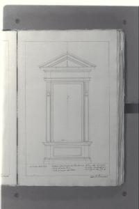 - NOTIZIE STORICO CRITICHE Il cosiddetto "Album Piermarini" è un taccuino di particolari e note, un fascicolo di 58 fogli (116 pagine) che raccoglie disegni e scritti riferiti a opere di Piermarini, Pellegrini, Segrè, Richino e Giocondo Albertolli; di questi, probabilmente nessuno è autografo di Piermarini. La sua impaginazione, la tecnica disegnativa impiegata in gran parte dei fogli e l'aspetto grafico sembrano quelli preparatori a incisioni per una pubblicazione: secondo parte della critica, potrebbe trattarsi di una bozza, redatta da un collaboratore (forse Marcellino Segrè), al fine di farne un manuale a uso dell'Accademia di Belle Arti. L'album è una copia del secondo dei due Zibaldoni di Giuseppe Piermarini, conservati presso la Biblioteca Comunale di Foligno con il titolo "Libro di appunti, ricordi, disegni vari".\nIl foglio mostra una finestra del primo piano del Teatro alla Scala; nei dettagli, i profili delle modanature hanno caratteri in parte ancora barocchi.