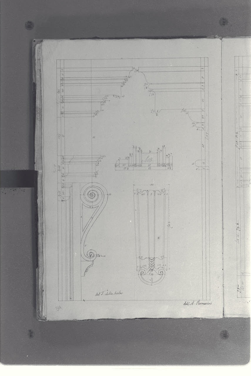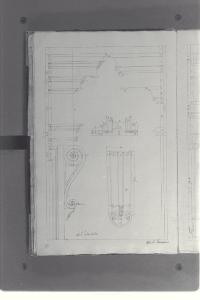 - NOTIZIE STORICO CRITICHE Il cosiddetto "Album Piermarini" è un taccuino di particolari e note, un fascicolo di 58 fogli (116 pagine) che raccoglie disegni e scritti riferiti a opere di Piermarini, Pellegrini, Segrè, Richino e Giocondo Albertolli; di questi, probabilmente nessuno è autografo di Piermarini. La sua impaginazione, la tecnica disegnativa impiegata in gran parte dei fogli e l'aspetto grafico sembrano quelli preparatori a incisioni per una pubblicazione: secondo parte della critica, potrebbe trattarsi di una bozza, redatta da un collaboratore (forse Marcellino Segrè), al fine di farne un manuale a uso dell'Accademia di Belle Arti. L'album è una copia del secondo dei due Zibaldoni di Giuseppe Piermarini, conservati presso la Biblioteca Comunale di Foligno con il titolo "Libro di appunti, ricordi, disegni vari".\nIl foglio mostra un particolare di finestra del Teatro alla Scala; a destra è visibile la cornice dell'imposta della volta sopra la platea.