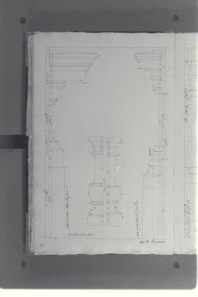 - NOTIZIE STORICO CRITICHE Il cosiddetto "Album Piermarini" è un taccuino di particolari e note, un fascicolo di 58 fogli (116 pagine) che raccoglie disegni e scritti riferiti a opere di Piermarini, Pellegrini, Segrè, Richino e Giocondo Albertolli; di questi, probabilmente nessuno è autografo di Piermarini. La sua impaginazione, la tecnica disegnativa impiegata in gran parte dei fogli e l'aspetto grafico sembrano quelli preparatori a incisioni per una pubblicazione: secondo parte della critica, potrebbe trattarsi di una bozza, redatta da un collaboratore (forse Marcellino Segrè), al fine di farne un manuale a uso dell'Accademia di Belle Arti. L'album è una copia del secondo dei due Zibaldoni di Giuseppe Piermarini, conservati presso la Biblioteca Comunale di Foligno con il titolo "Libro di appunti, ricordi, disegni vari".\nIl foglio mostra particolari della facciata del Teatro alla Scala.