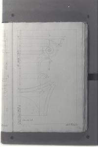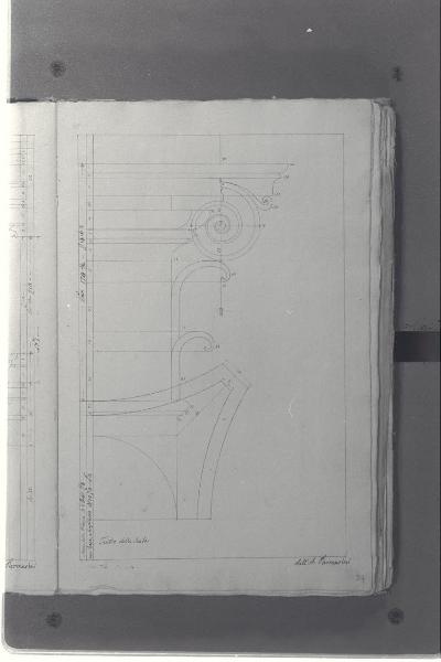 - NOTIZIE STORICO CRITICHE Il cosiddetto "Album Piermarini" è un taccuino di particolari e note, un fascicolo di 58 fogli (116 pagine) che raccoglie disegni e scritti riferiti a opere di Piermarini, Pellegrini, Segrè, Richino e Giocondo Albertolli; di questi, probabilmente nessuno è autografo di Piermarini. La sua impaginazione, la tecnica disegnativa impiegata in gran parte dei fogli e l'aspetto grafico sembrano quelli preparatori a incisioni per una pubblicazione: secondo parte della critica, potrebbe trattarsi di una bozza, redatta da un collaboratore (forse Marcellino Segrè), al fine di farne un manuale a uso dell'Accademia di Belle Arti. L'album è una copia del secondo dei due Zibaldoni di Giuseppe Piermarini, conservati presso la Biblioteca Comunale di Foligno con il titolo "Libro di appunti, ricordi, disegni vari".\nIl foglio mostra un particolare della facciata del Teatro alla Scala.